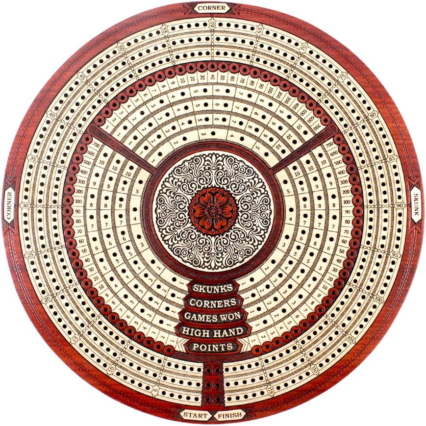 House of Cribbage presents innovative 3 tracks (120 Points) Round Shape Continuous Cribbage Board made for up to three players. The board can be used to play games between a pair of players or a trio. If you want to keep track of points, Skunks, Corners, High Hand and finished games then this board is the perfect board. All the fields have been engraved on maple wood and bloodwood. The complete board and box has three layers of lacquer to provide protection from spills and crumbs. The handmade cribbage board is made of natural Bloodwood / Maple. The white tracks are engraved on Maple wood and surrounded by Bloodwood. The storage drawer has enough space to store any size of cards. You can store 2 decks of poker or bridge cards along with 21 pegs. The drawer of cribbage box can be opened from any direction. If you push the drawer from direction 'A' it will move to the opposite direction 'B' and Vice Versa. The drawer is having lock which hold the drawer tightly. The Storage section is lined with fine maroon velvet pads and the bottom of the box has also the same felt which protects from scratches and enhances the stability of board. Free DrawString velvet bag is also provided to protect the board. Designed and crafted by Pleasant Times Industries. Playing Cards are NOT included (wherever shown in the images)