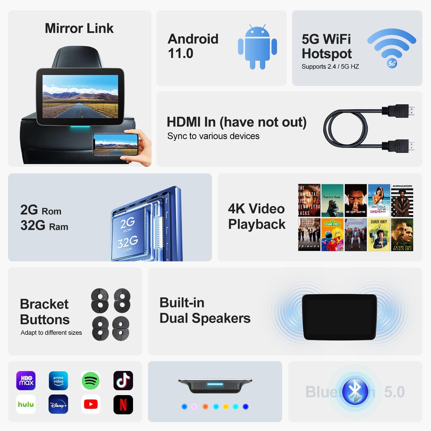 | BuiltIn Media | 10.1 Headrest Monitor Screen*1PC, 12V Cigarrete Lighter Cable*1PC, ACC Power Cable*1PC+User manual*1, Universal Mounting Bracket*1pc+Bracket Button*10PCS |