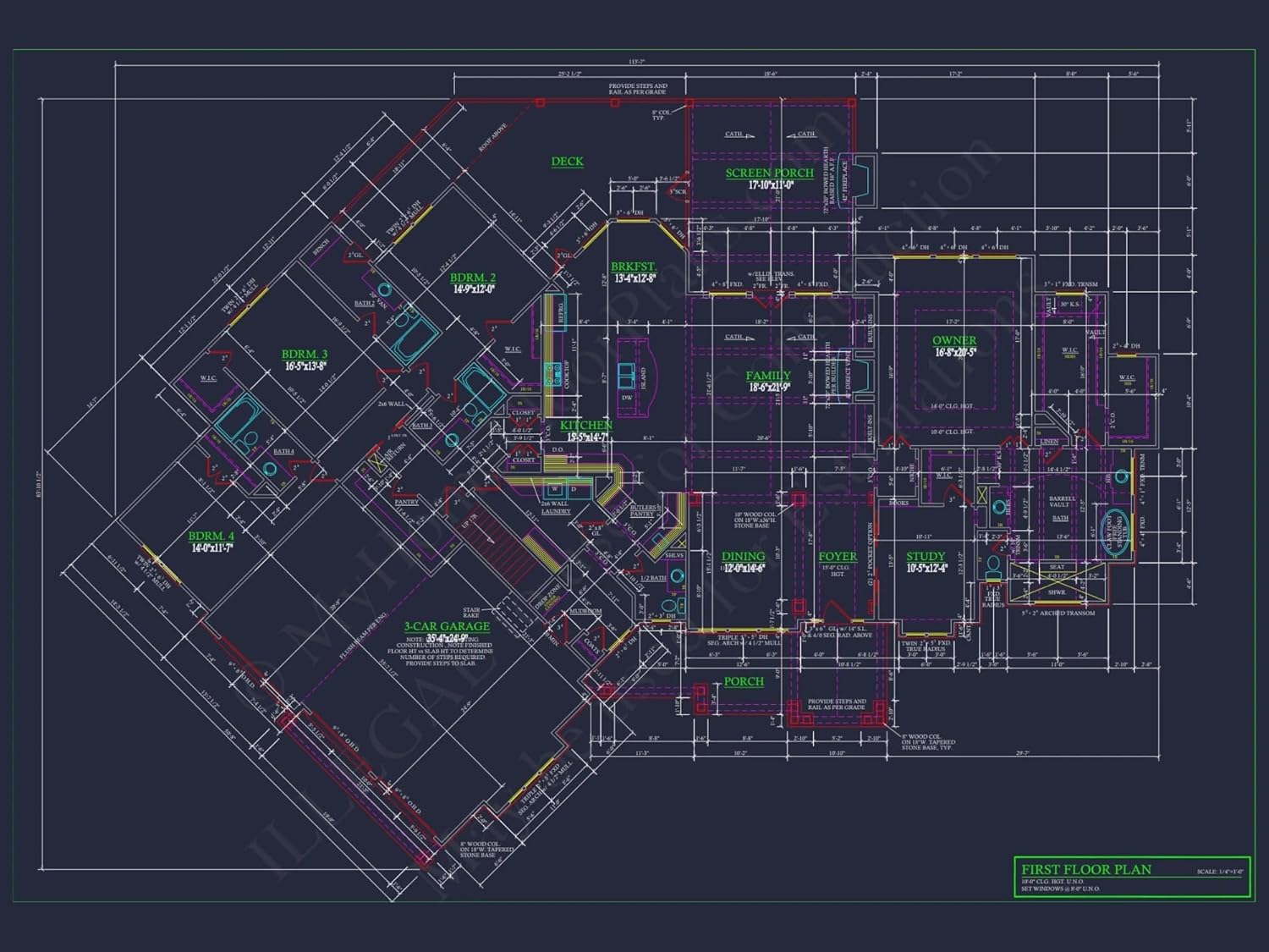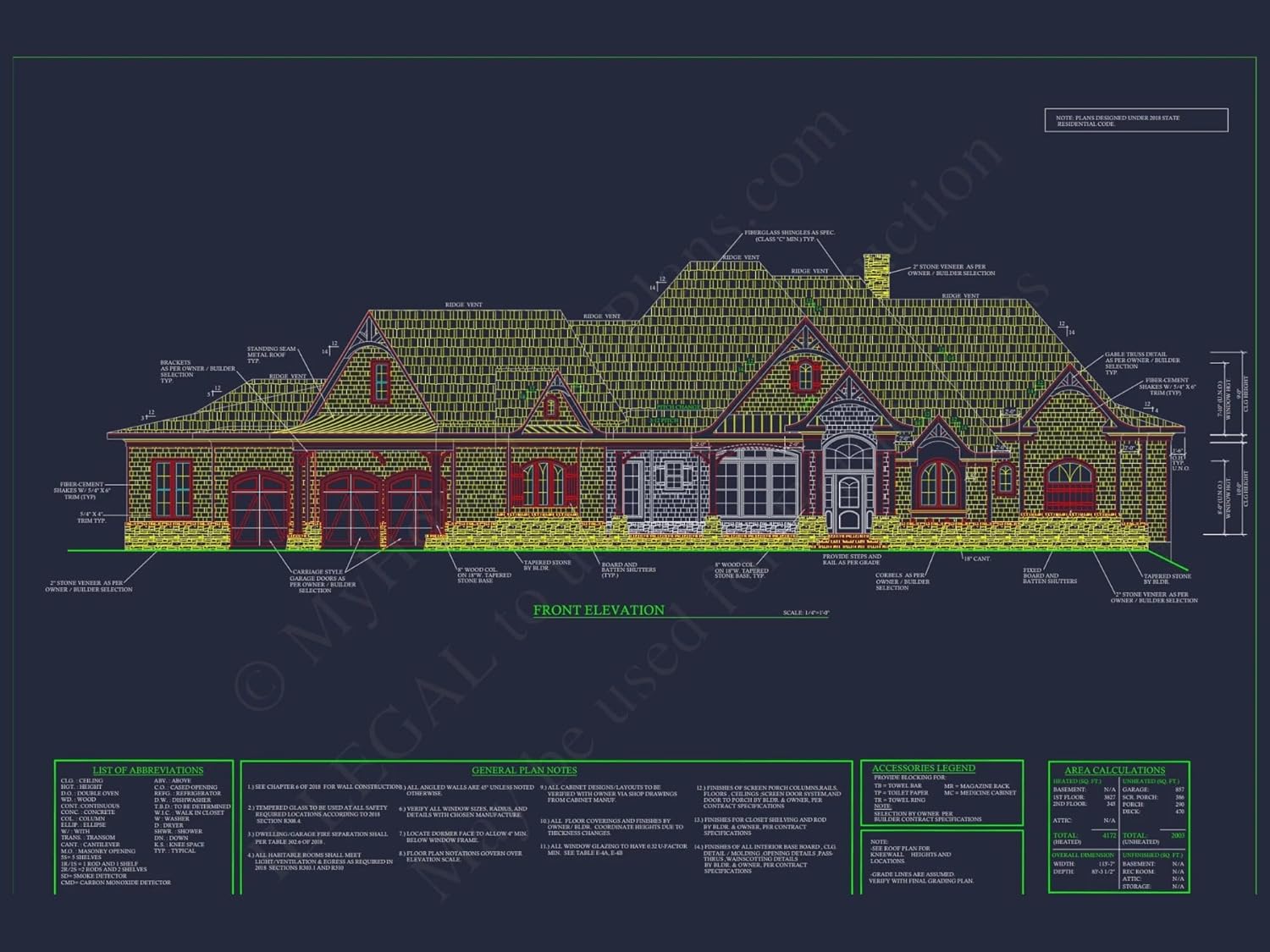 Width: 113′-7″Depth: 83′-4″Htd SF: 4,172Unhtd SF: 2,003French Country House Plan with Brick and Stone ExteriorDiscover timeless European charm and modern comfort in this 4-bedroom, 3.5-bath French Country house plan featuring 3,800 heated sq. ft. and a stately brick-and-stone façade.This French Country home design combines traditional European detailing with refined modern livability. Its exterior showcases a rich blend of brick, stone, and wood trim, while the interior offers generous open spaces and elegant finishes.Home Layout & DesignTotal Heated Area: 3,800 sq. ft.Stories: 1.5 levels with a private upper guest suite or bonus room.Garage: Spacious 3-car side-entry garage with storage area.Porches: Front covered entry and large rear patio for outdoor entertaining.Bedrooms & BathroomsPrimary Suite: First-floor Owner's Retreat with tray ceiling, dual vanities, and walk-in closet.Secondary Bedrooms: Two additional bedrooms on the main floor, each with private or shared baths.Bonus Room: Optional fourth bedroom or media suite upstairs with full bath.Main Living AreasVaulted great room anchored by a stone fireplace and surrounded by natural light.Open kitchen layout with a large island, walk-in pantry, and direct access to the dining room.Butler's pantry connects the kitchen and dining room for effortless entertaining.Home office or study with front-facing windows—ideal for remote work.Flexible layout accommodates family gatherings and modern lifestyles. See more open layouts.Exterior Materials & StyleThe combination of brick, stone, and wood gables defines the French Country aesthetic, creating a warm and welcoming look that blends rustic character with European refinement. Arched dormers and timber brackets add architectural charm and depth to the façade. Explore more at ArchDaily.Outdoor Living & EntertainingFront porch with stone steps and archway entry for a grand welcome.Rear covered patio