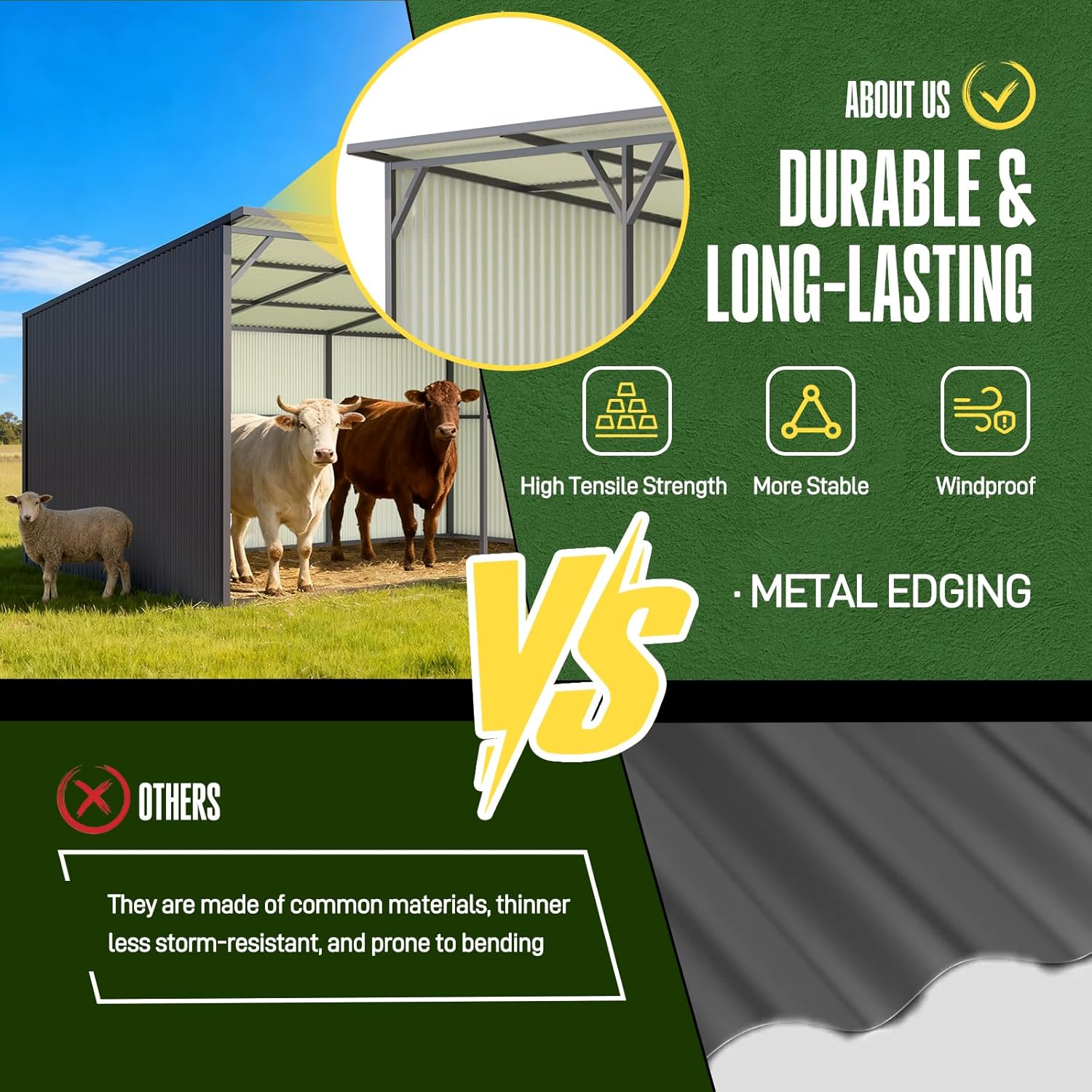๐ก๏ธ The Ultimate Outdoor Shelter: MachPro 20x12 ft Heavy Duty Metal Livestock ShedThe MachPro Heavy-Duty Metal Livestock Shelter is the ideal solution for farms, ranches, and large outdoor spaces. This structure is known as a Run-in Shelter, featuring a 3-sided design that allows easy access while providing all-weather protection for your horses, cattle, or sheep. It is also versatile enough to function as a sturdy carport for equipment or a dry storage area for hay.๐ช Built Beyond Standard: Superior Structure and StabilityMachPro is focused on delivering quality and safety that exceeds standard market specifications:Reinforced Main Frame: Unlike many thin-walled competitors, our main frame and base utilize upgraded 13-gauge (2-inch square steel tube) for maximum structural integrity and stability.Wind-Resistant Anchoring: To ensure stability in harsh weather, the kit includes professional **M12x100mm expansion bolts** for securely anchoring the base frame into solid foundations like concrete or asphalt.Galvanized Durability: The entire structure, including the frame and panels, is constructed from galvanized steel, offering excellent resistance to rust and corrosion, ensuring a long service life.๐ด Livestock Safety: Humanized Edge Protection DesignWe understand that protecting your animals is paramount. This shelter incorporates a key safety detail:Protective Edge Wrapping: The unique **Color steel tile edge wrapping** covers all sharp edges of the corrugated metal panels, significantly reducing the risk of your horses or cattle sustaining cuts or scrapes while rubbing against the walls.โ๏ธ All-Weather and All-Season ProtectionThe sloped roof and premium materials ensure the shelter handles various climate conditions:Sloped Roof System: The roof uses 23-gauge galvanized corrugated steel panels with a sloping design that promotes rapid water drainage and resists heavy rain and snow impact.UV Protection: The durable roofing effectively blocks harsh UV rays, providing a cool and safe retreat during hot summer months.๐ ๏ธ Installation Requirements and TipsProduct Dimensions: The assembled size is: 240 in. Length * 144 in. Width * 125 in. Front Height * 100 in. Back Height.Team Assembly Required: Due to the heavy-duty components, the manual strongly advises that **three or more adults** work together for safe and efficient assembly.Foundation Requirement: The shelter must be assembled on a level, solid base such as concrete or asphalt.Tools Needed: Installation requires specialized tools, including a hammer drill (16mm bit), rivet gun, level, and ladder.Choose MachPro for a stronger, safer, and more durable farm solution.