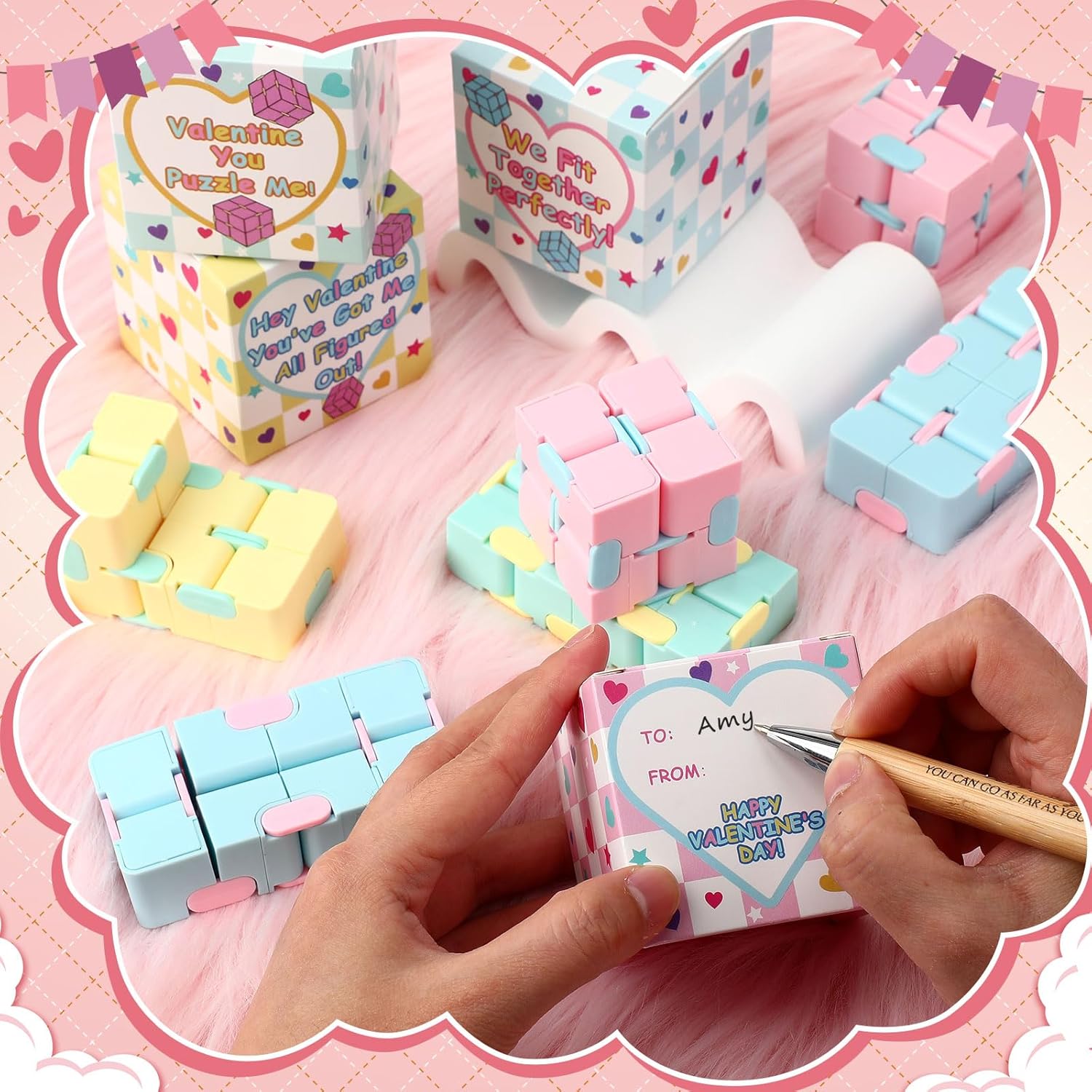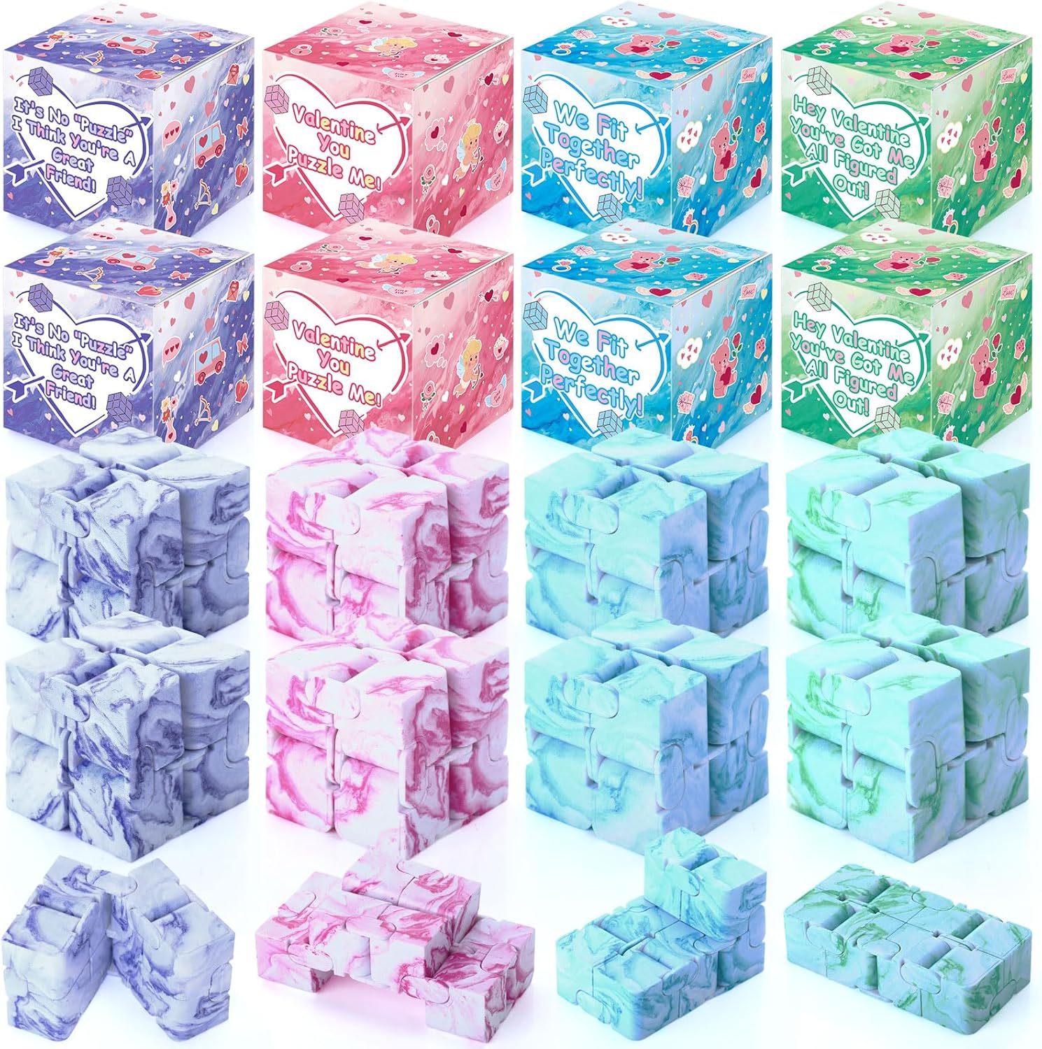 Features: Convenient and portable: These 1.57-inch square cubes are designed to meet the needs of most people in multiple scenarios. The stress-relieving cubes easily fit into a pocket for hassle-free portability. Ideal gifts for Valentine's Day: They are the good Valentine's Day gifts for adults. Ideal for occasions such as Valentine's day party, gift exchanges, elementary gatherings, home activities, rewards, and party gifts. Specifications: Material: ABS,paper Color: macaron color Size: Stress relief cube:1.57 x 1.57 x 1.57 inches/ 4 x 4 x 4 cm Gift box:2.4 x 2.4 x 2.4 inches/ 6 x 6 x 6 cm Package includes: 28 x Valentine's Day cubes 28 x Valentine's Day gift boxes Notes: Manual measurement, please allow slight errors on size.