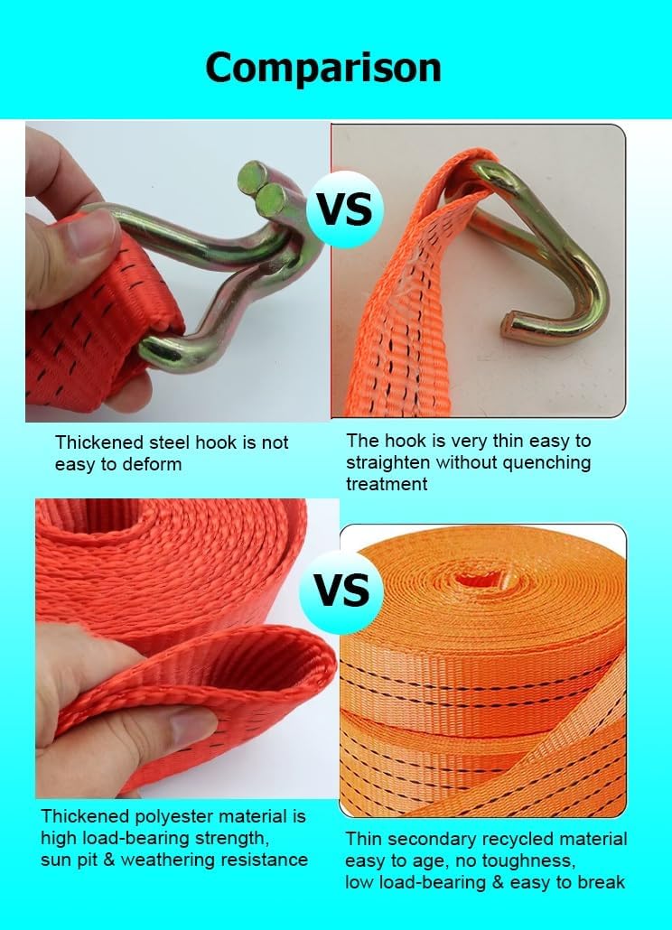 Are you still worried about cargo falling off easily?Heavy duty ratchet straps with steel hooks, tie down straps can be widely used to secure cargo for moving and securing equipment, motorcycles, trucks, vans, kayaks, warehouses, etc.Specifications: Name: Polyester Tie Down StrapsColor: RedMaterial: Polyester Straps + Steel Frame + Aluminum HandleWidth: 5 cm / 2 inLength: 1.0 m / 3.3 Ft , 2.0 m / 6.6 Ft , 3.0 m / 9.8 Ft , 4.0 m / 13.1 Ft , 5.0 m / 16.4 Ft , 6.0 m / 19.7 Ft , 8.0 m / 26.2 Ft , 10.0 m / 32.8 Ft , 12.0 m / 39.4 Ft , 15.0 m / 49.2 Ft , 18.0 m / 59.1 Ft , 20.0 m / 65.6 FtApplication: Bundling goods /fixing goods, etc.Features:1. High-density cargo straps are wear-resistant and break-resistant2. Cargo straps are easy to use, not easy to fall off and can be fixed immediately3. Truck straps have an easy-release mechanism to easily release the tension on the straps4. Ratchet straps have double-stitched edges to prevent slipping during use; ensure that the cargo is firmly fixed in place, giving you peace of mind when transporting cargo; reinforced stitching adds extra strength and stability to the straps5. Lashing strap are equipped with double J-hooks for easy fixation6. Tow strap have strong pulling force, 5tons/11023lbs7. Tie down straps are widely used, including moving, securing cargo, camping or other tie-down needs, such as warehouses, motorcycles, canoes, kayaks, ATVs, trucks, boxes, furniture, lawn equipment, etcPackage Included:1 x Heavy Duty Ratchet Strap with HookTighten Ratchet Straps Steps:1. Pass the strap under the tensioner rotating shaft2. Pass the strap through the center slot of the tensioner rotating shaft3. Pull the tensioner handle back and forthRelease Ratchet Straps Steps:1. Fasten the safety plate outwards2. Open the tensioner to level3. Pull out the strapNotes:1. Du