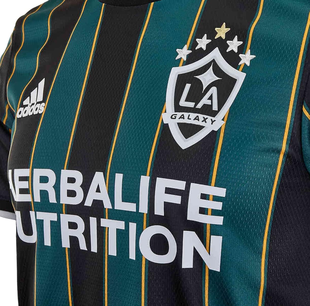 The adidas 21/22 LA Galaxy away authentic jersey is the perfect way to show your support for the team. The retro teal green and bold pinstripe design are a fresh take on a classic look, and the lightweight, breathable fabric will keep you comfortable whether you're cheering on the team from the stands or wearing it around town. Plus, this product is made with recycled content as part of our commitment to ending plastic waste. So proudly wear your support for the LA Galaxy with this eco-friendly jersey.