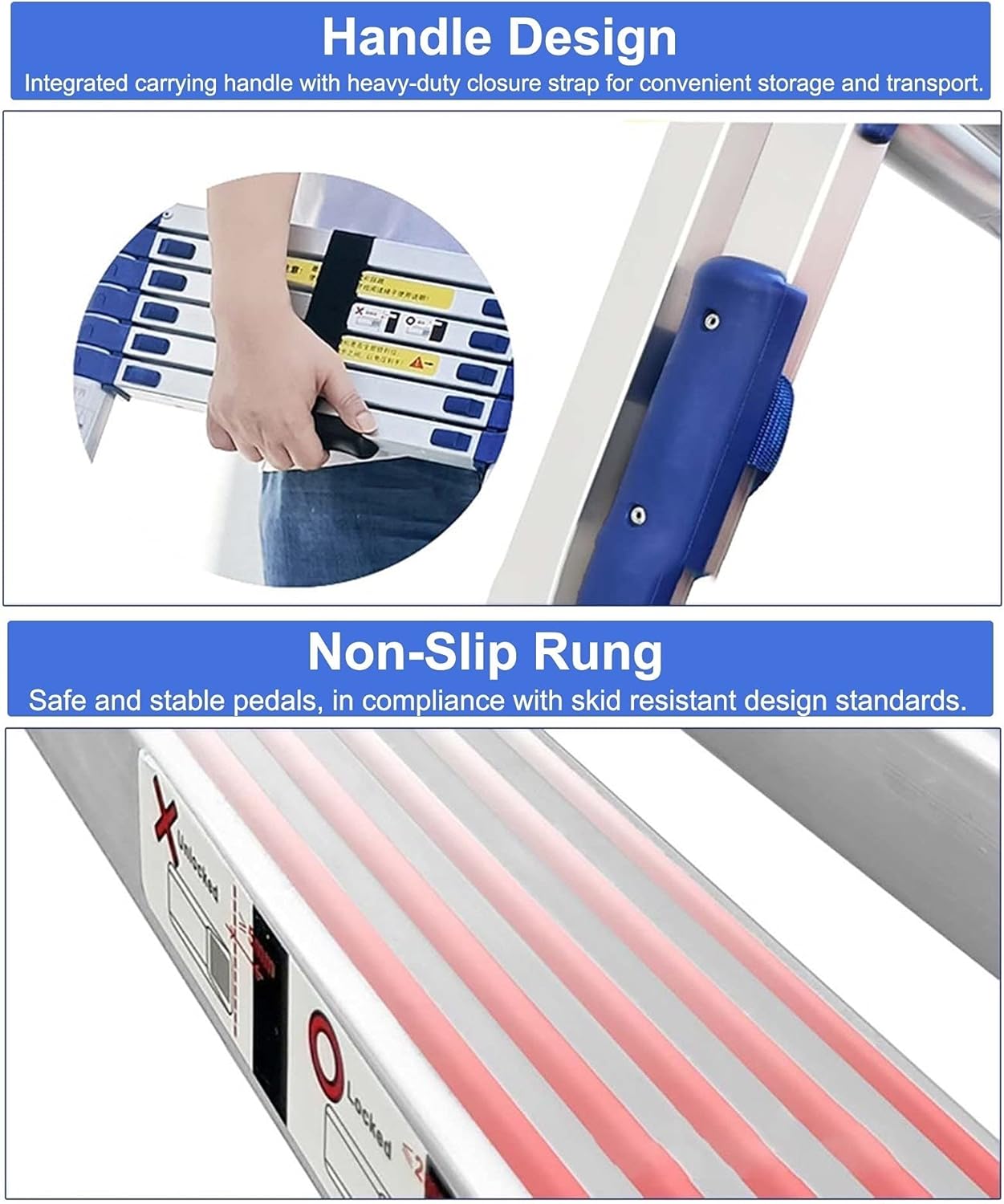 - This is our new multi-purpose folding ladder. Our ladders are lightweight, portable and suitable for a a variety of domestic and commercial uses. Using such kind of tools have already very popular in DIY projects, tradesmen, whatever garden or workshop. - SpecificationMaterial: Aluminium alloyUnfolded size: (Optional) 1.5m/5ft , 1.9m/6.2ft , 2.1m/6.8ft , 2.3m/7.5ft , 2.7m/8.8ft , 3.1m/10ft , 3.5m/11.5ft , 3.9m/12.7ft , 4.3m/14ft , 4.7m/15.5ft , 5.1m/16.7ft , 5.5m/18ft , 5.9m/19ft , 6.3m/20.5ft , 6.7m/22ft , 7.1m/23ft , 8.1m/26ftMaximum user weight: 150kg/ 330lb- Most liked features:For both individual and professional useDurable, and rustproof it's well worth the money - Technical features:Save space:Easily fits into cupboards, the back of a van or the boot of a car. Lightweight and easily portable .This practical and reliable ladder will prove worth its weight in gold when tackling a variety of tasks in and outside the home; no more struggling with awkwardly long extension ladders.Great for loft access, window cleaning, gutter cleaning, interior and exterior painting, general decorating, accessing cupboards, maintenance tasks and more!Thanks to the ladder's extendable design, you can safely get into smaller confined spaces which a larger ladder wouldn't allow.- Please Note: Do not place your hands or fingers between the rung when closing the ladder.- Package contents:1 x Telescopic ladder★ Note:1. Because of the manual measurement 1-3cm size error, take physical size must prevail.2. There is a slight difference between the image and the actual element caused by the brightness.3. Incorrect maintenance mode will seriously affect the appearance of the product and the useful life.4. If you have any further questions about our Ladder , please contact us first. We are happy to help you. I hope you have a wonderful