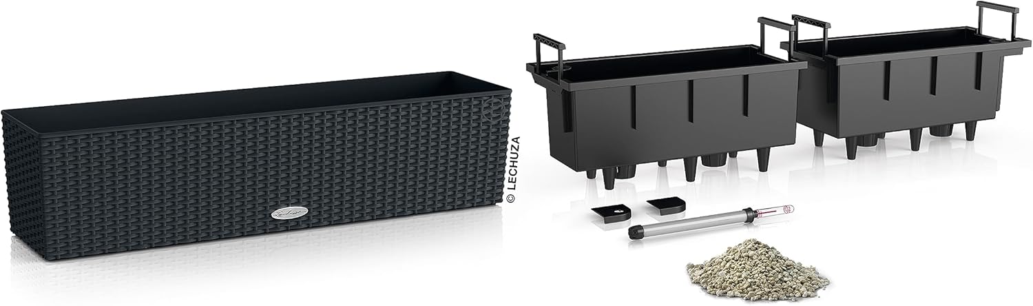 The Balconera Cottage balcony planter makes the dream of romantic balcony greenery come true. The all-round rattan look gives the planter a rustic charm, making it an excellent partner for your balcony plants. Classics such as begonias or fuchsias are particularly suitable, but lavender or hydrangeas also spread a good mood on your balcony. Thanks to practical plant inserts with retractable handles, the planting can be changed in a relaxed manner on the table or on the floor, while the balcony boxes remain on the railing. All year round, the integrated irrigation system supplies the plants with the sufficient amount of water. So no one needs to worry about the plants going thirsty in midsummer. The base screw allows excess watering or rainwater to run off outdoors. The Balconera Cottage is available in the following colours and sizes: Granite, Graphite Black, White, Mocha, Light Grey or Sand Brown and sizes with 50 cm and 80 cm width. All Lechuza planters are manufactured in Germany under the highest production standards. The durable plastic containers are unbreakable, weather-resistant and fully recyclable. All black plant inserts are made from 100% recycled plastic. Package contents: 1 x Lechuza Balconera Cottage, including irrigation system, Lechuza-Pon plant substrate as drainage layer and a plant insert with retractable handles. Material: Plastic Measurements: 79 x 19 x 19 cm, Plant insert: 15.2 x 36.6 cm, Pack of 2 The matching balcony box holders are available separately.