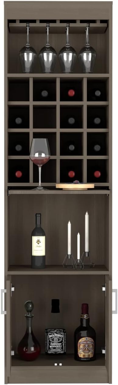 The Modoc Bar Cabinet has you covered when it comes to entertainment. Stylish design combined with a modern look that is sure to impress your guests. Entertain your guest with this spectacular 71" High Bar cabinet, Featuring a 12 Wine glass rack, comes with a retractable and concealable serving tray to prepare your drink, and includes 16 Bottle liquor cubbies. Designed with smokey oak manufactured wood. Dimensions: Height: 71,1” Width: 20” Depth: 12,7“.