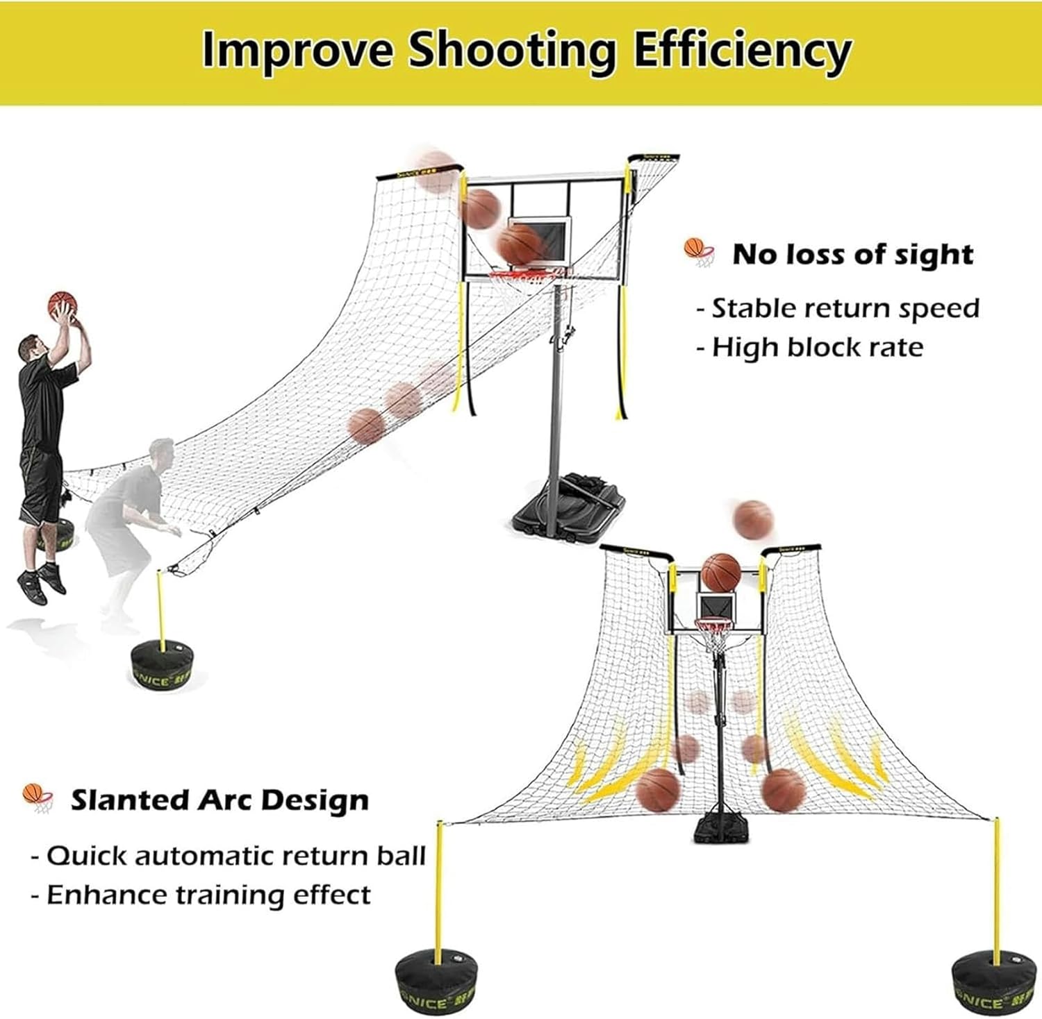 Basketball Rebounder Perfect your shot! more shooting. Less chg. The Basketball return system conveniently rolls the ball back to you after each shot. The result is more time honing your skills and less time Scrambling for loose balls. Suitable for basketball frames in parks gyms homes schools playgrounds backyards gyms and other outdoor places.Specification :Material: Iron Frame + Woven NetColor: BlackWeight: 15.4 lbs/7 kgReturn Net Size: 15.7x15.7ft/4.8x4.8mApplicable Backboard Width: 3.3-5.9ft/1-1.8mFeatures :Reliable iron frame sturdy & loadbearingThe rebound net will not block the view90° rotatable brackets covering almost all shooting angles.No need to chase the ball around the gym for missed shots.Multiply shooting time making shots 80% more efficient.Fits most basketball hoops indoors & outdoorsPerfect gift for family friends kids who love basketballPackage Includes 1 x Basketball Shot Trainer(Basketball basket not included.)Tips :If it snows and you don't use it we recommend that you store it indoors during the winter.Minor errors can be 1-3cm error due to different batches and manual measurs. Thank you for your understanding.There may be chromatic aberration due to the difference between the recording lamp and the display. Please refer to the actual product.