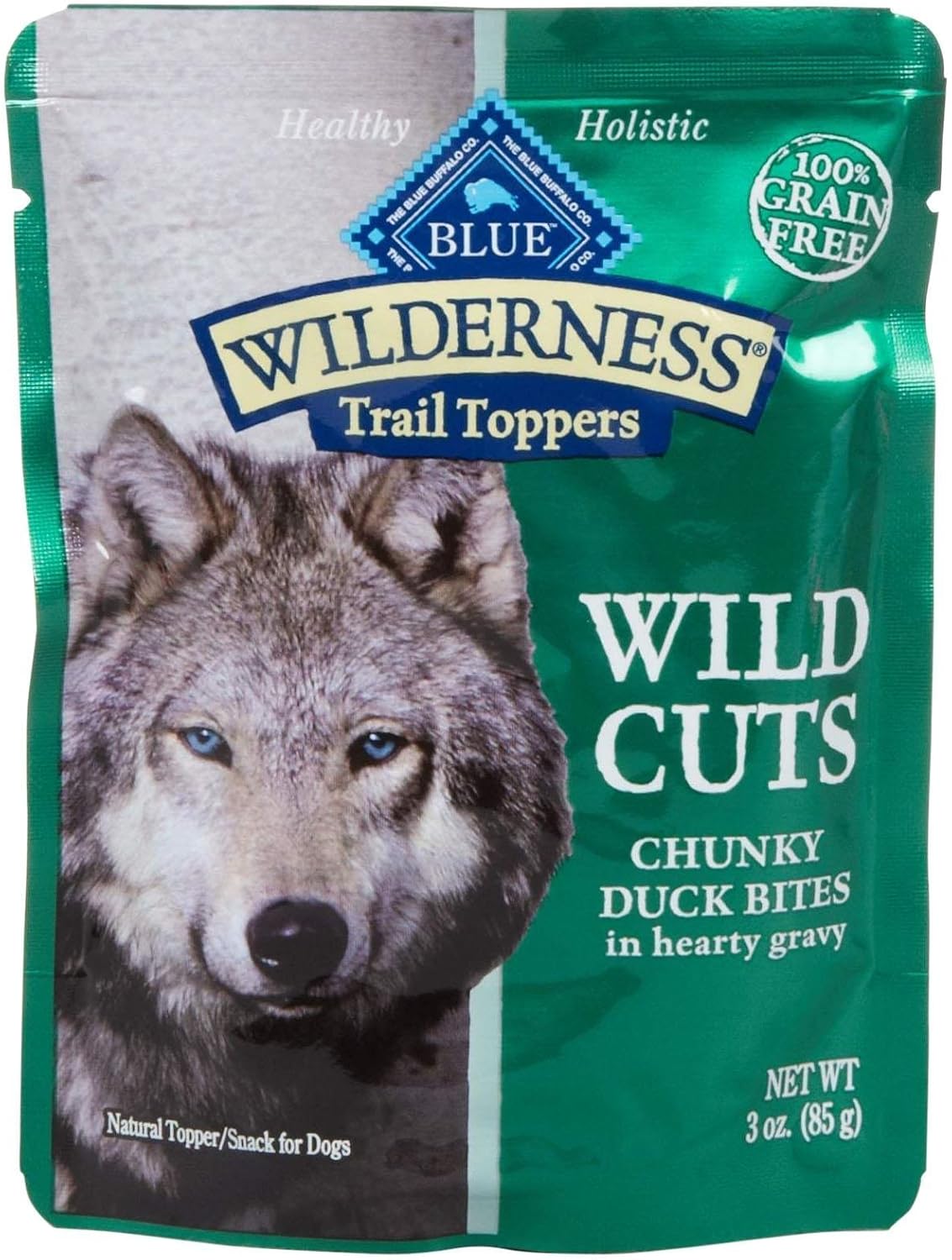 Product Description Treat your dog's wild side with BLUE Wilderness Trail Toppers Wild Cuts Natural Wet Dog Food. Made with high-quality salmon as the first ingredient, this grain-free wet dog food provides a delicious taste and the nutrients your dog needs to stay active. Mix these meal toppers into your dog's dry food for added flavor, or serve as a tasty treat between meals. And like all Blue Buffalo natural dog food recipes, BLUE Wilderness wet dog food toppers do not contain any chicken (or poultry) by-product meals. They are also free of corn, wheat, soy, artificial flavors, and preservatives. From the Manufacturer These delicious meal toppers make any meal a special treat. Made with delicious bites of real salmon steeped in irresistible gravy, BLUE Wilderness Wild Cuts Trail Toppers are made to satisfy the spirit of the wolf that lives on in your dog.