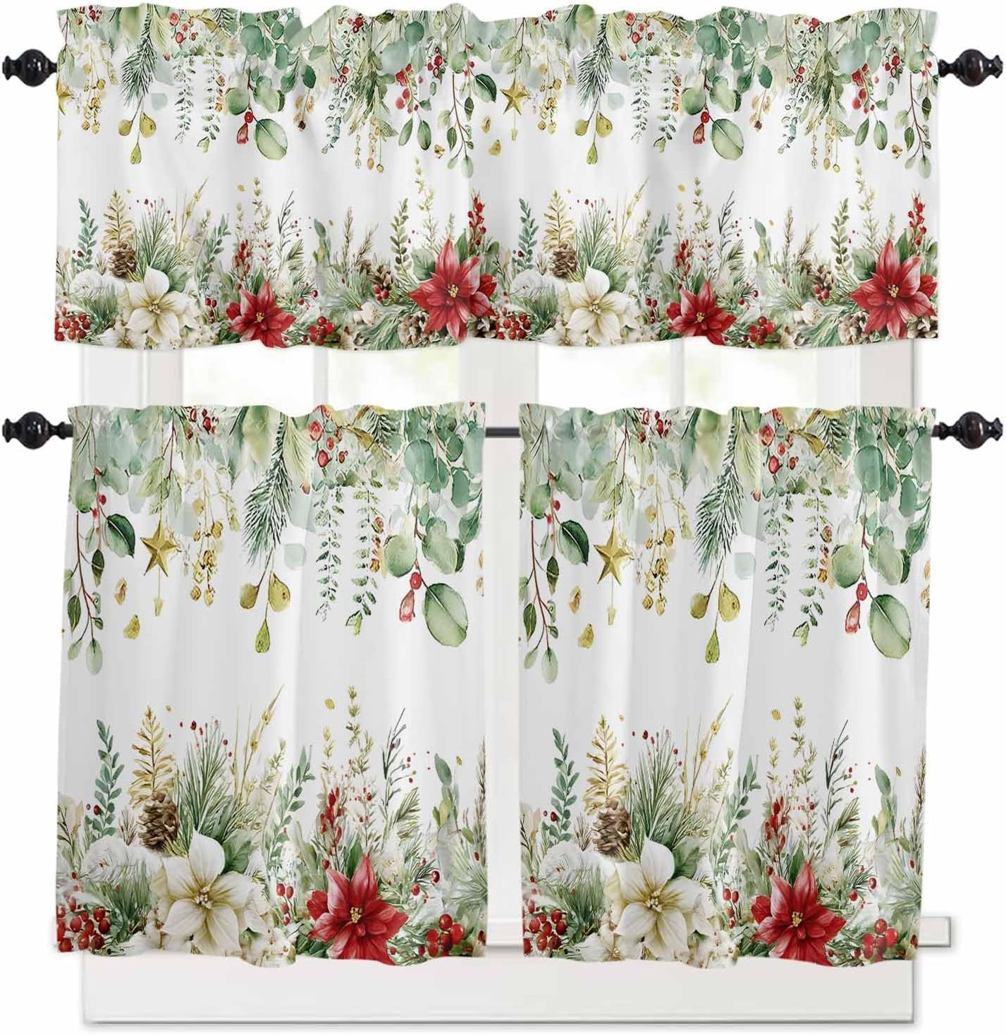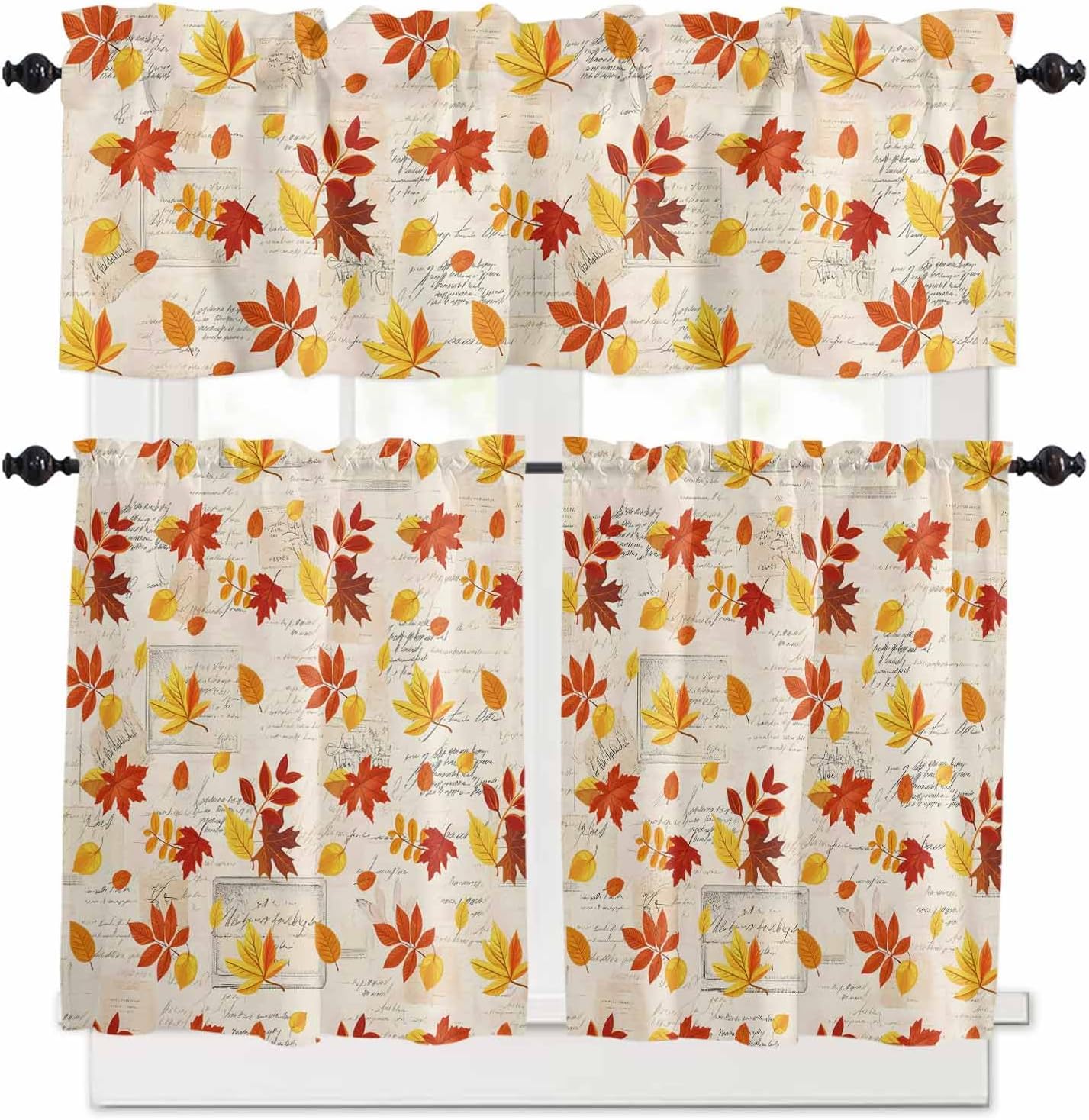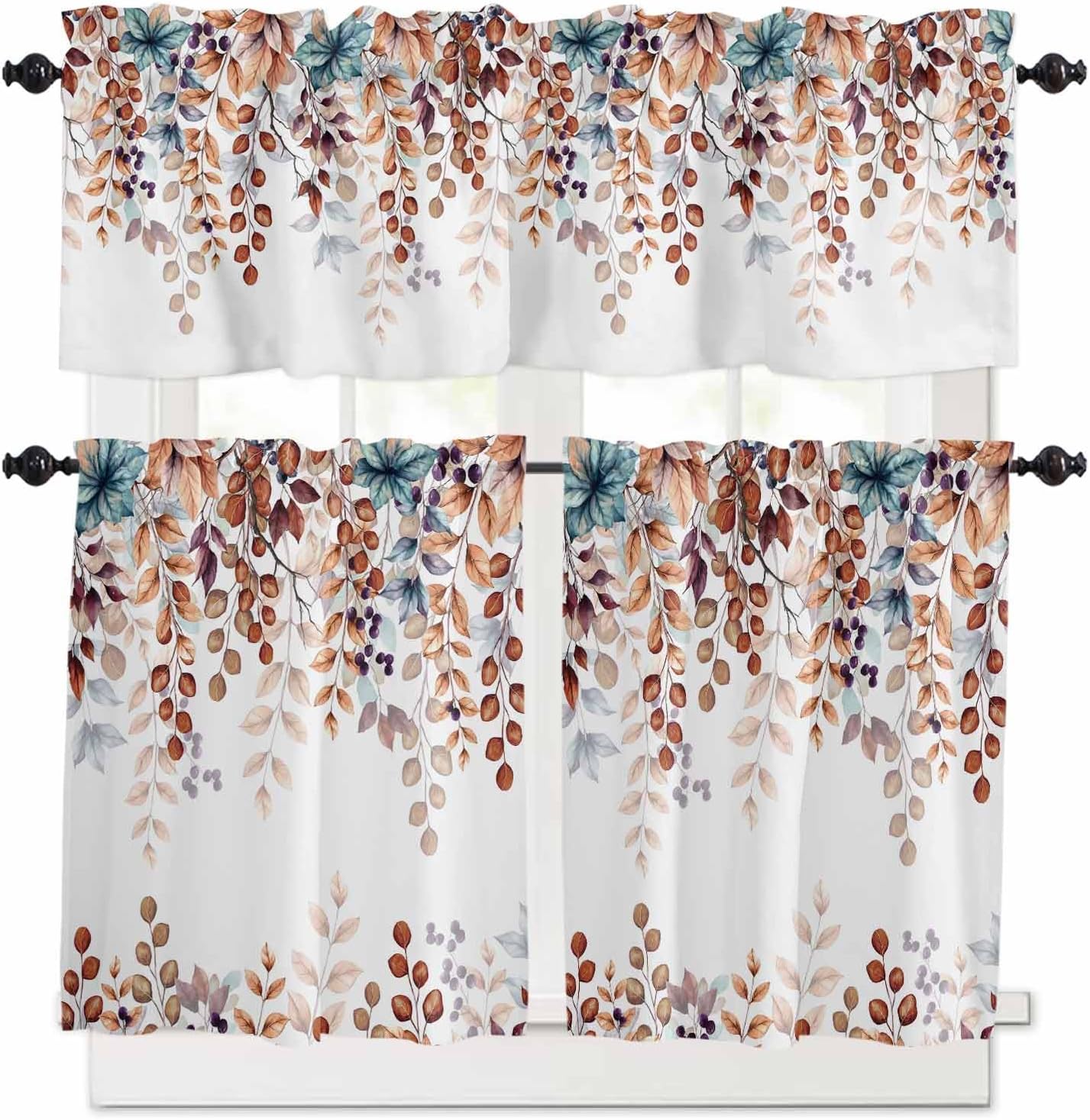 The Curtain Valance and Tier Curtains Set is A Perfect Choice for You.1 panel valance & 2 panel tier curtains per package. Valance: 54"W x 18"L inches, Tier: 27.5"W x24"L Inches per panel. Valance: 54"W x 18"L inches, Tier: 27.5"W x36"L Inches per panel.Constructed with 1 inch header and 3 inch rod pocket, easy installed on a curtain rod. Besides, our curtain and tier is safe, using the new print technology. We also offer a variety of colors and styles to meet your different needs.The tier and valance curtains work with any decor. The farmhouse window valance is made of premium polyester fabric with excellent workmanship, no off-line and wrinkle. If you need ironing, high-grade polyester fabric can withstand frequent washing, color will with time. The tiers and valance 3 piece set create relax feeling for your house.Great and adorable curtains set perfectly worked out for your kitchen window, living room, bathroom, sun porch, basement windows, camp trailer, office, RV window, and other occasions. The valances will bring casual luxury and classic to decor.The tier and rod pocket curtain can ensure ventilation and prevent people seeing inside from outside. The material can prevent bright beams of sun hurting your eyes while providing enough privacy. The tiers and valance 3 piece set transform your space from a boring room into a stylish one. The opaque curtain valances not only block part of the dazzling sunlight but also protect your furniture and floors, adding extra glamour to your home decorThe rod pocket measures 3inch with a 1inch connector for easy hanging and fits most standard rods. The window curtain and tier curtains set is easy to move the draperies along the rod. Easily hand on and smoothly slide over your standard curtain rods.