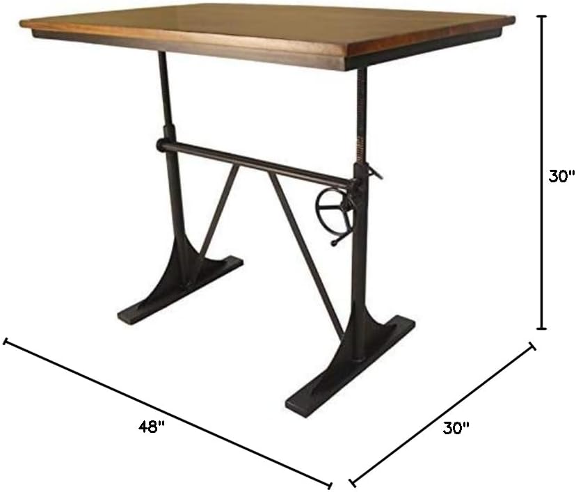 Our Brio adjustable-height desk features an industrial style crank that lets you smoothly raise and lower the wooden desktop to suit your needs. Crafted of solid mango wood and cast iron. The angled braces and sturdy feet provide stability. Inspired by industrial-era functionality and style, the work surface is finished with an Elm stain.Features:- Elm Stain Mango Wood Table Top- Adjustable Table Height, Adjust from a 30" Dining Table to a 42" Bar Table- Powder Coated Cast Iron Base and Crank.Specifications:- Product Dimensions: 30"H x 30"W x 48"D- Product Weight: 79 lbs.