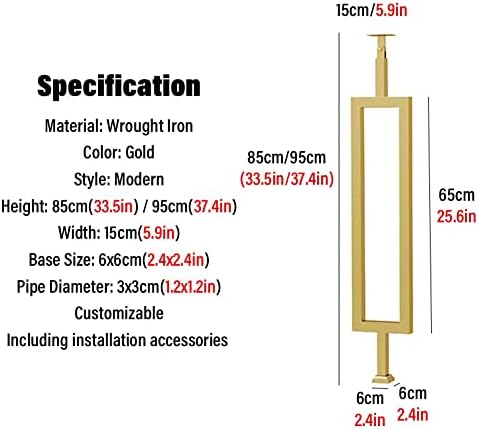Elevate the safety and aesthetic appeal of your indoor and outdoor spaces with our Gold Metal Stair Balusters. Designed for both level and sloped staircases, these customizable stair spindles are a perfect blend of style and functionality, making them an ideal choice for your garden decks or indoor guardrails. **Key Features:** **Enhanced Safety:** Our stair balusters provide dependable support for users of all ages, including children, the elderly, and individuals with mobility challenges. Their robust design ensures peace of mind as you navigate stairs confidently. **Versatile Applications:** These balusters are suitable for a wide variety of settings, including staircases, corridors, rooftops, aisles, balconies, and terraces. Whether for residential or commercial properties, they enhance safety while complementing the overall decor. **Specifications:** - **Material:** Wrought Iron - **Color Options:** Elegant Gold - **Style:** Modern - **Height Variants:** 85cm (33.5in) / 95cm (37.4in) - **Width:** 15cm (5.9in) - **Base Size:** 6x6cm (2.4x2.4in) - **Pipe Diameter:** 3x3cm (1.2x1.2in) **Includes:** All necessary installation accessories for a hassle-free setup. **Installation Tips:** To ensure an optimal fit, measure the total length of the intended installation area to determine the number of balusters required. Upgrade your space with our Gold Metal Stair Balusters and enjoy the perfect combination of safety and elegance. Transform your stairs into a stylish feature while ensuring the well-being of everyone in your home or business.