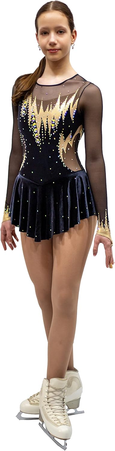 BUNDLE WITH SKATE GUARDS. Being a figure skater entails feeling at ease on the ice. The optimal approach to achieving comfort with your body involves donning flattering and stunning while exuding a sense of fun. This particular dress from SG.moda perfectly fulfills these criteria. Hailing from the USA, SG.moda showcases its excellence through this exquisite dress, handcrafted in Ukraine using the finest materials sourced from Italy and Germany. The discernible disparity in superior craftsmanship becomes evident when you don this attire for practice sessions or competitions. Your presence will captivate the audience, making it nearly impossible for them to divert their gaze. The dress's splendid color complements all skin tones and beautifully resonates with the icy surroundings. You'll embody the elegance of an ice queen or princess as you execute your routine. The extended sleeves will provide more warmth to your arms than shorter ones, accentuating flattering lines that grace your body. Don't hesitate to give your all while skating in this dress – we are confident you'll emanate a fabulous aura. The dress's cut is universally flattering for every figure skater fortunate enough to wear it. The lengthy skirt flows generously, creating a mesmerizing effect as it fans out from your body while gliding across the ice, reminiscent of flight. Undoubtedly, this dress will swiftly become one of your favorite choices in your figure skating wardrobe rotation. Be ready to proudly declare its SG.moda origin, secure in the knowledge that you've invested in the highest available quality crafted from the finest materials sourced from Italy and Germany.