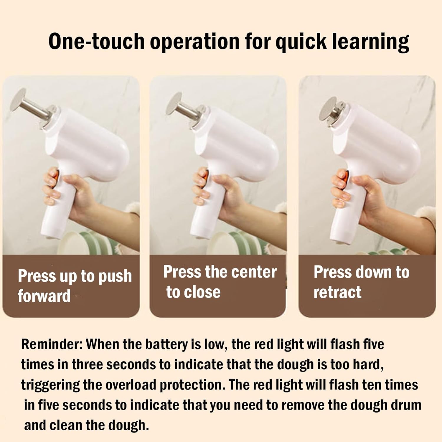 Product Name: Handheld Noodle MakerRated Power: 65WRated Capacity: 200gLithium Battery Capacity: 1500mAhCharging Time: 4 hoursRetraction Method: Double-click the on/off buttonColor: WhiteInput Voltage/Current: 5V-2ANo-load Retraction Speed: 5.5mm/sUsage Percentage on Full Charge: Approximately 80-100 TimesStart Method: Long-press the on/off buttonStop Method: Single on/off buttonMaterial: Push Rod/Noodle Pressing Bucket/Dough Rolling Mold (304 Stainless Steel), Measuring Cup, Scraper (PP), Dough Rolling Head (304 Stainless Steel)Accessories:Dough Rolling Bucket*1Dough Rolling Molds*5Dough Rolling Head*1Scraper*1Measuring Cup*1Instruction Manual*1