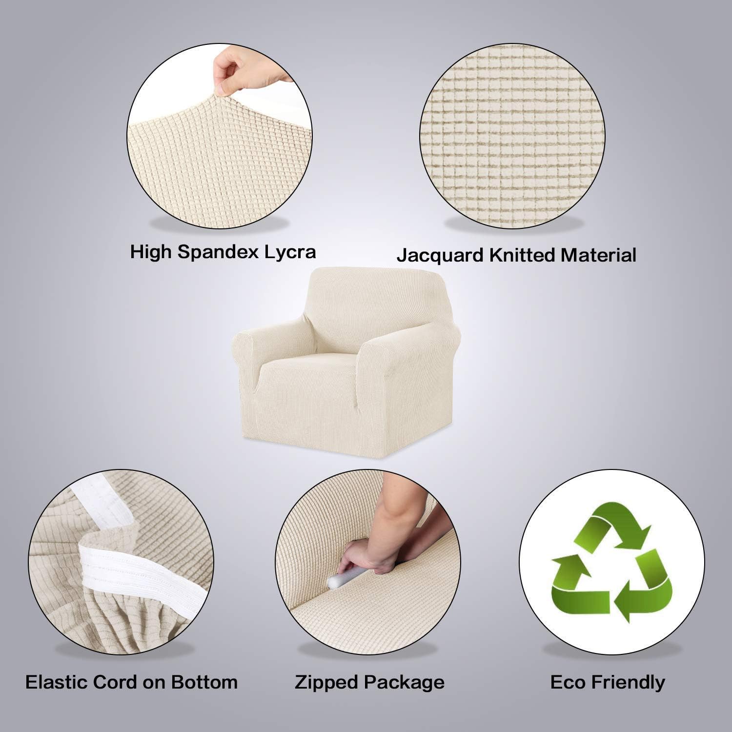They are made of durable and gentle 85% polyester and 15% spandex knitted jacquard fabric, soft rich and textured. The sofa slipcover can fit the width between 32-48 inches. And the ottoman cover fit most ottoman with 27”-32" length, 27”-32" width, 17”-18" height. Easy to install, with instructional tags to seamlessly guide you through the installation process. Buy them together can better protect the furniture and give you a better feeling.It is the perfect choice for all those who are in need of functionality and utility value, but want to avoid compromising on good looks and aesthetic appeal.