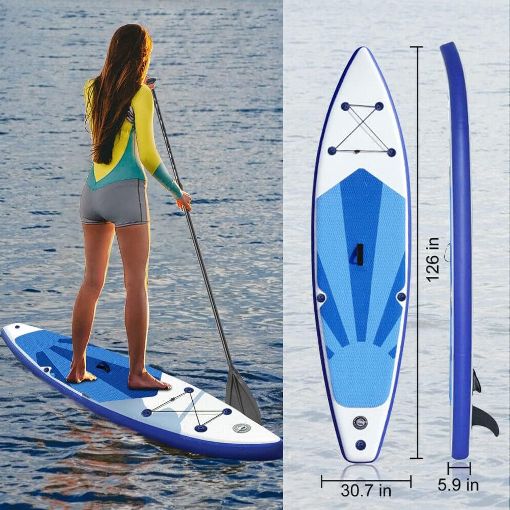 Compared with surfing and kayaking, paddle board is much easier. With one board and one paddle, you can glide on relatively calm water, and it is more suitable for urban water scenarios. SUP is perfect for water sports activities such as exploring, touring, fishing, paddling, and yoga. Specifications Net weight: 15.87lbs Weight capacity: 300lbs Inflated board dimensions: 10.5' x 30.7'' x 6'' Deck pad material: EVA Max pressure: 15PSI Recommend inflating to 12-15PSI for use Skill level: Beginners & All Riders Features Adjustable aluminum paddle Removable fins Safety leash Grab handle Secure bungee tie-downs Non-slip deck Easy storage and carry Lightweight Package List 1*Inflatable board 1*Adjustable-length aluminum paddle 1*Paddle pump 3*Removable fins 1*Coiled ankle leash 1*Waterproof phone case 1*Emergency repair kit 1*Spacious storage bag