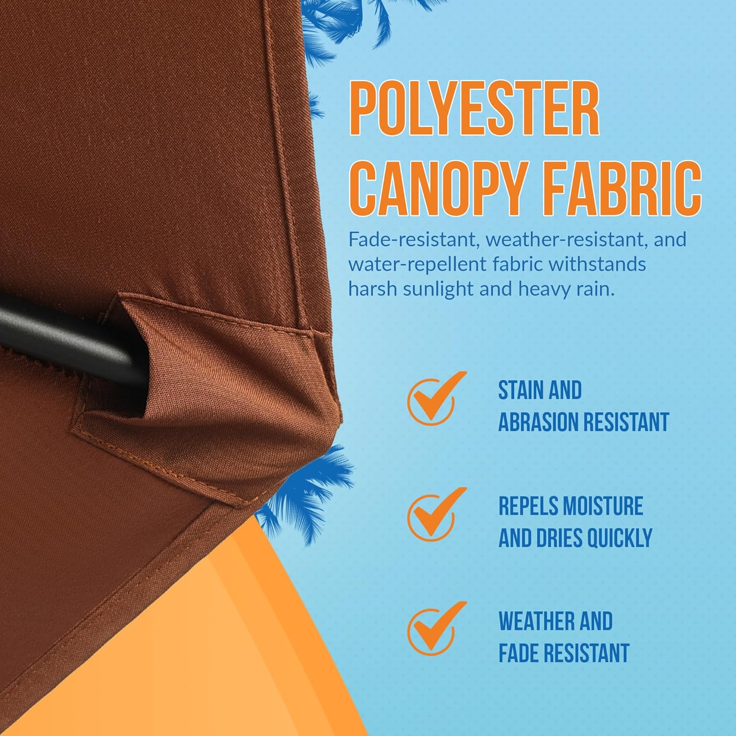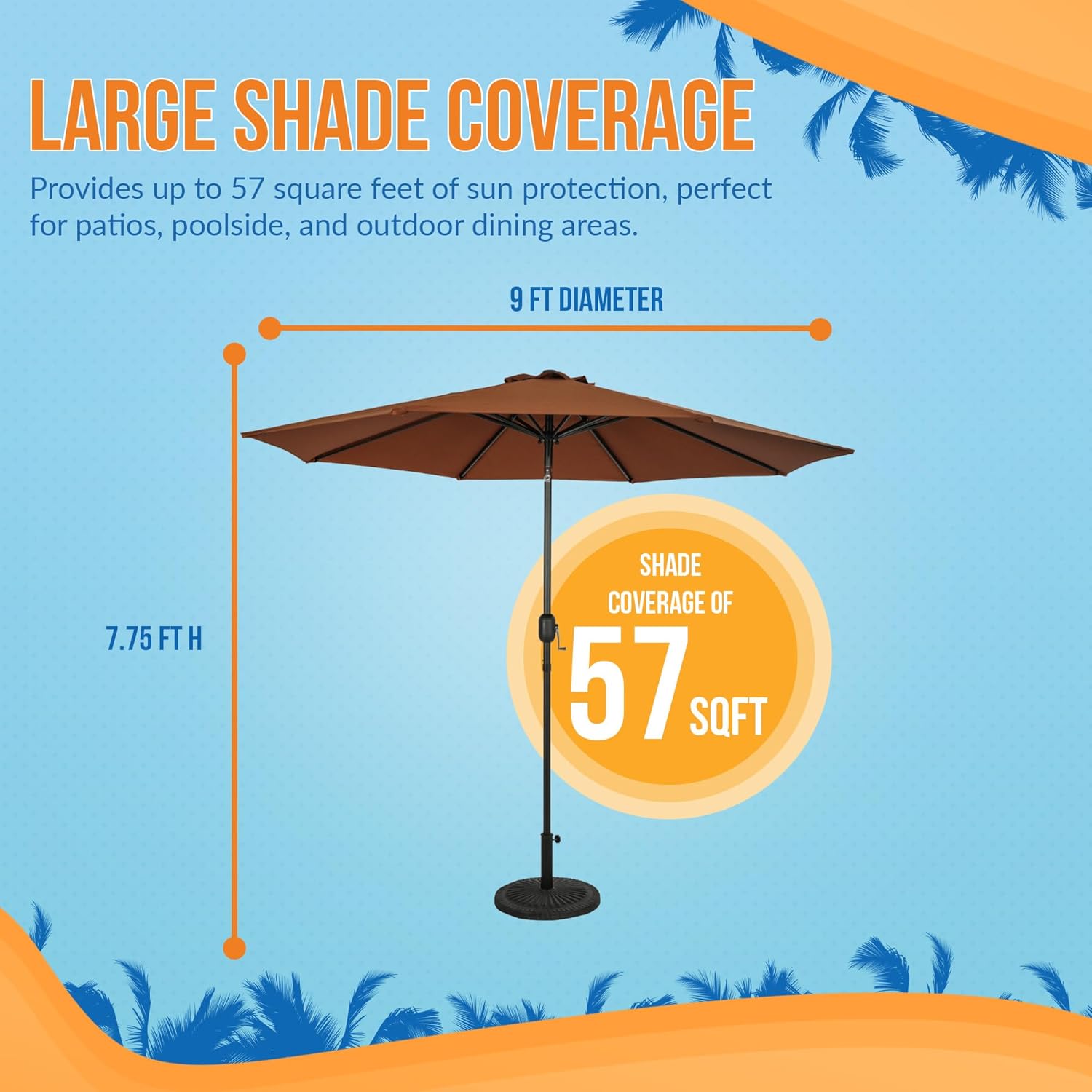 The Trinidad II 9-Ft Octagon Market Umbrella provides reliable shade and durability, making it the perfect addition to any outdoor patio umbrella setup. Designed for versatile use, this 9 ft patio umbrella offers outdoor shades for patio spaces, poolside retreats, and backyard gatherings. Its heavy-duty patio umbrella construction features an 8-rib support system and a rust-resistant steel pole with a bronze powder-coated finish, ensuring long-lasting durability. The large outdoor umbrella provides 57 square feet of shade, making it an excellent choice for a patio set with umbrella or as a backyard umbrella for lounging areas. Built for superior performance, this market umbrella features a fade-resistant, water-repellent polyester canopy, protecting against sun and rain. A push-to-tilt function allows users to adjust the umbrella outdoor patio for optimal shade, while a crank mechanism ensures smooth operation. The single wind vent enhances airflow, reducing wind resistance, making this an ideal patio umbrella with base solution for stability. Whether used as a pool umbrella or a deck umbrella, this 9' market umbrella blends function and style seamlessly. Perfect for patios, porches, and balconies, this outdoor umbrella is ideal for patio umbrellas & shade solutions, including use as a porch umbrella or balcony shades for apartments patio. It pairs well with an umbrella base outdoor patio for added stability, creating an inviting outdoor space. This 9 foot patio umbrella is a top-tier choice for those seeking a table umbrella or a pool umbrella with base for inground pools. With a one-year warranty on the frame and canopy, the Trinidad II ensures lasting protection for outdoor umbrellas for patio setups. Dimensions: 9-ft L x 9-ft W x 7.75-ft H. Weight: 10 lbs. Dimensions: 9-ft L x 9-ft W x 7.75-ft H. Weight: 10 lbs.