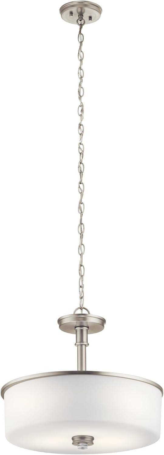 The Joelson 17.75" 3 light convertible pendant or semi flush features a classic look with its Brushed Nickel finish and satin etched cased opal and clear glass accent glass. The Joelson convertible pendant or semi flush is retro inspired and is perfect in several aesthetic environments, including traditional and modern.