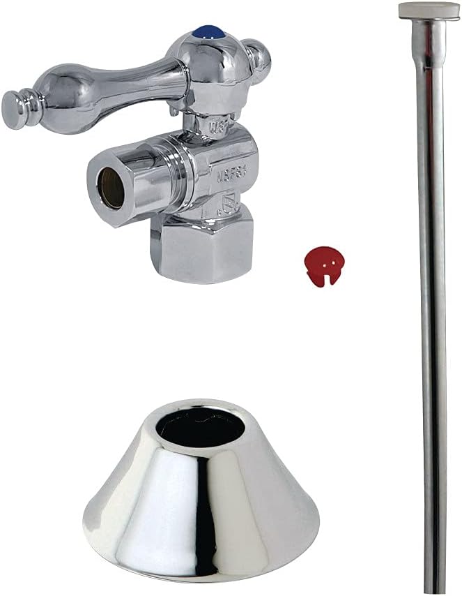 Product Description This 3-piece toilet supply kit from Kingston Brass provides all the necessary parts in the water flow process of your bathroom toilet. The set includes a single lever 1/2-14 NPT x 3/8" O.D. compression angle stop, a 20" flat head supply line, and a 1/2" IPS bell flange. Constructed of high quality brass and a tarnish-resistant finish, designed for long-lasting performance. Available in a variety of stunning finishes ready to match any home decor. From the Manufacturer This 3-Piece toilet supply kit from Kingston Brass provides all the necessary parts in the water flow process of your bathroom toilet. The set includes a single lever 1/2-Inch compression angle stop, a 20-Inch flat closet supply line, and a 1/2-Inch IPS bell flange. Each of these parts are made from satin nickel, constructed in solid brass for durability and reliability.
