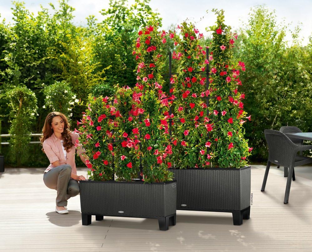 This innovative planter features 3 independent liners with water reservoirs, each is equipped with its own a water gauge, which indicates when the reservoir is empty and needs to be filled with water. Water is conveyed directly to the roots of your plants by a unique funnel system which keeps the top soil surface area dry. A specially formulated granular material, LECHUZA PON, separates your potting soil from its water reservoir, helps aerates the roots, provides nutrition and helps regulate adequate water supply. This attractive planter has wicker like finish and is suitable for both indoor as well as outdoor use. Perfect for patios and as a space divider. Ideal for blooming plants, edibles and foliage. Optional trellis and pedestal available.