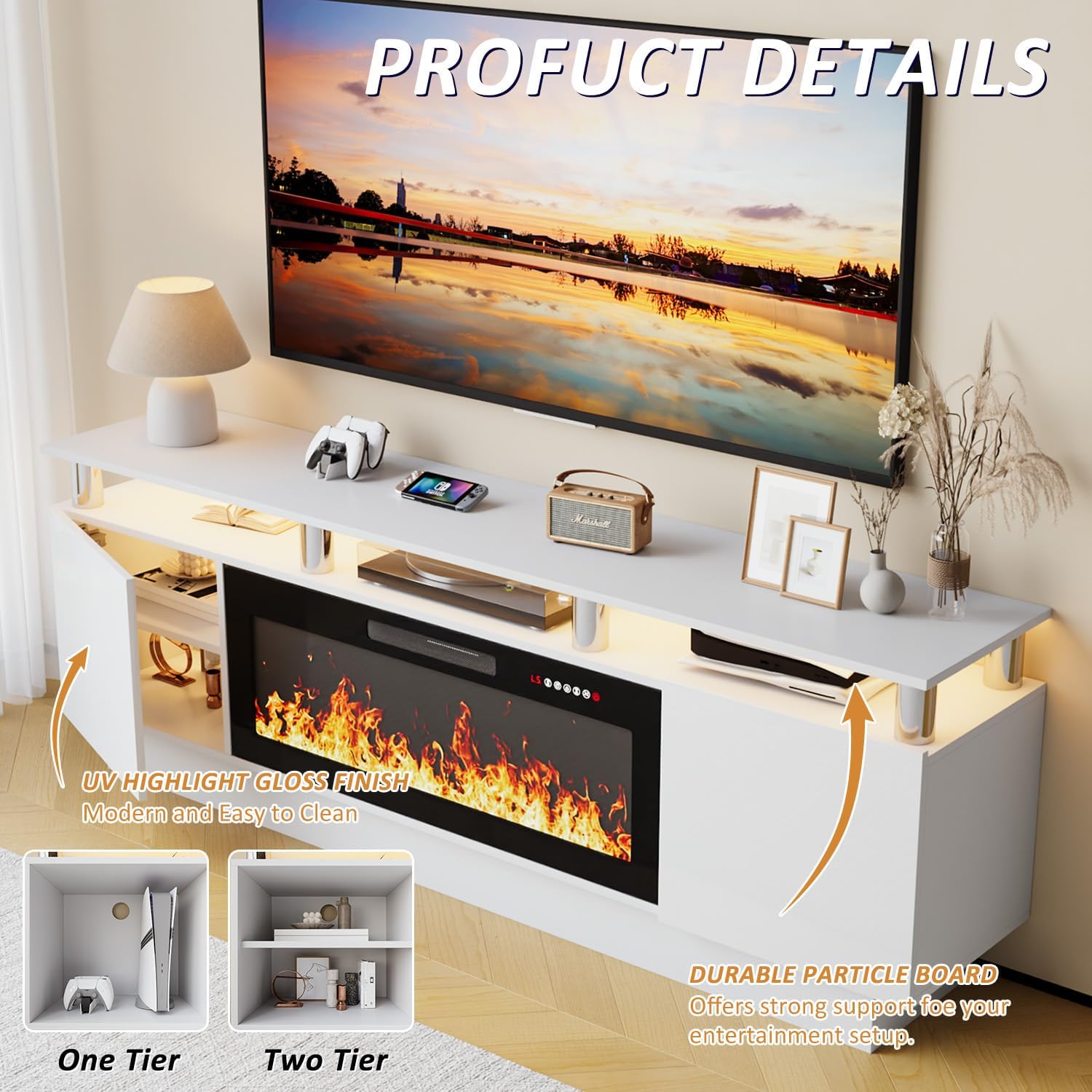 Dial in your perfect level of cozy, no matter the weather, with a 70?TV Stand with Electric Fireplace. The 36?electric fireplace insert is a great way to keep your room (up to 400 sq. ft.) warm or to create the perfect ambiance for the evening. The Fireplace and TV Stand has plenty of open storage. 2 shelves and 2 cabinet with door keep your entertainment components organized with built-in wire management to keep cords tangle free. The TV Stand accommodates most 80?flat panel TVs with a maximum weight of 300 lbs. Made from laminated engineered wood, this Fireplace TV Console is both elegant and affordable. The TV Stand ships flat in 2 boxes and requires assembly. Two adults are recommended to assemble.