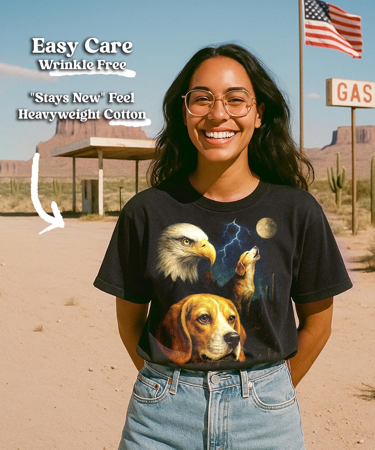 This epic dog themed black t-shirt for men and women by BabaTees is made from 100% premium heavyweight cotton with a classic fit. Designed and screen printed in the USA, it showcases a majestic vintage-style scene of dogs howling at the moon, with desert backdrops, mesas, cactuses, and an American bald eagle. The thick yet stretchy fabric offers comfort, breathability, and durability, making it perfect for everyday wear or as a thoughtful gift for any dog lover. Whether you're into patriotic themes, wildlife, or western vibes, this shirt captures the unique spirit of the outdoors.