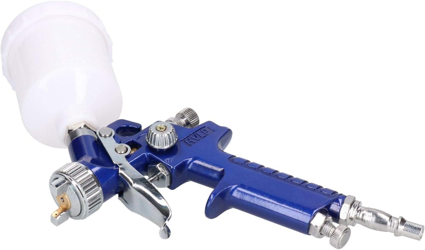 Professional spray gun for commercial or occasional use Mini HVLP spray gun Suitable for touch up use which enables it to be ideal for small areas such as motorbike tanks / casings etc... Gravity feed spray gun which is perfect as all of the paint is used up (no waste) Plastic top which keeps the weight down when using Suitable for all paints including modern water based paints Mini model is designed to be used for smaller jobs where large volumes of paint is not needed / required Ideal for touch up or detail work HVLP gun which has greater transfer efficiency than suction feed spray guns and reduces over spray, saving on time and material costs Die cast aluminium gun body with 2 step trigger control Spray width and fluid adjustable 3 controls you can control the width of the fan, how much air pressure and how much paint comes out as well 1.0mm nozzle so suitable for slightly thicker paintSPECIFICATIONS Low operating pressure of 43 PSI Air Consumption - 4 CFM Cup size 125ml Pattern width - 190mm 1/4" BSP quick release air inlet 1.0mm nozzle
