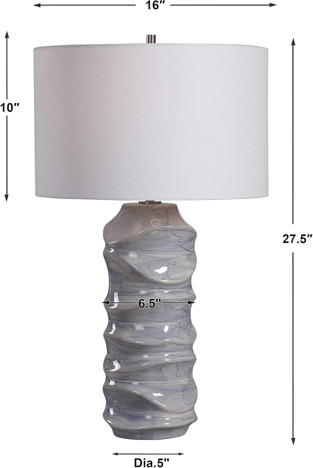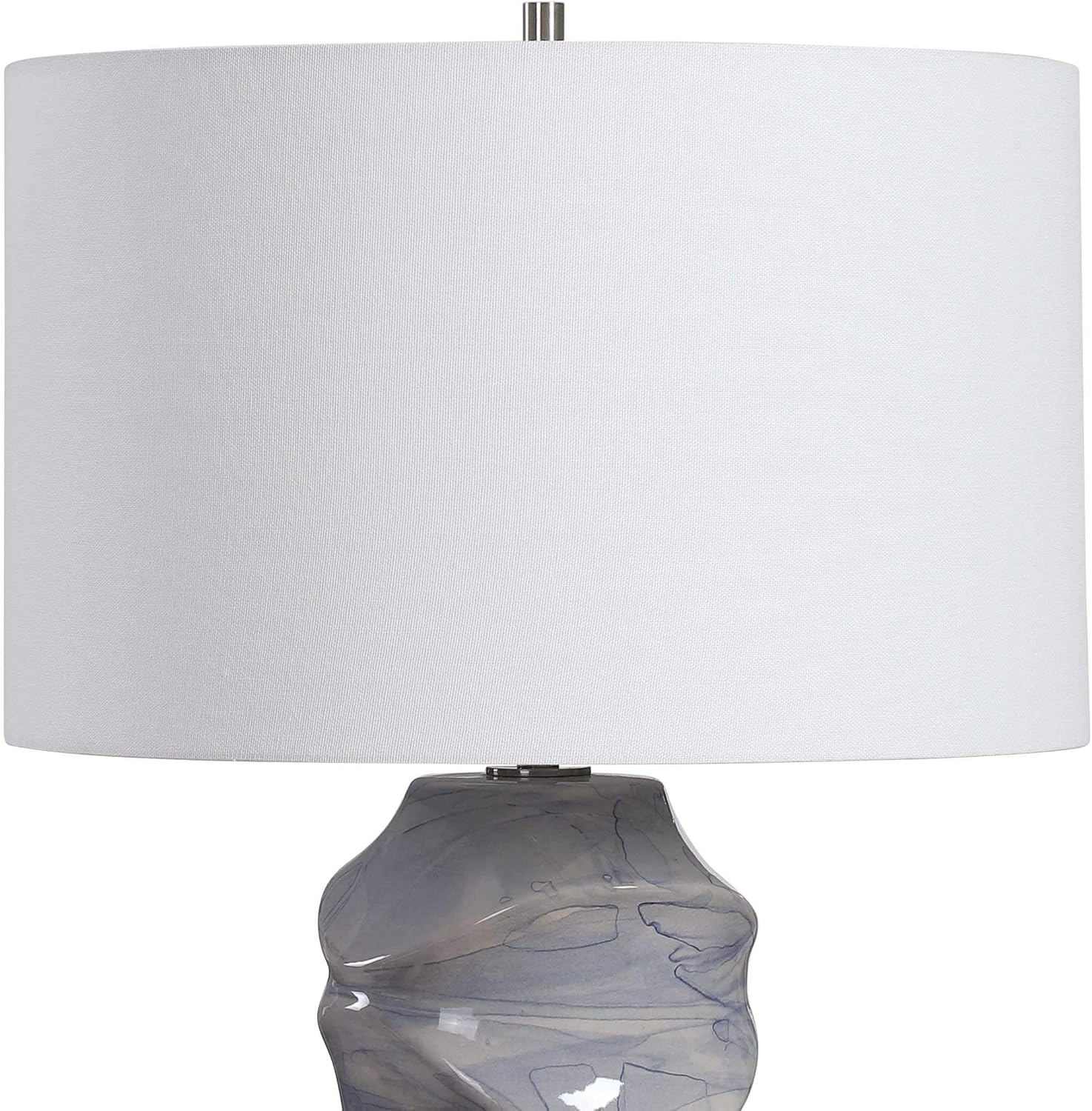 A contemporary take on classic blue and white ceramics, this table lamp features a unique sculpted design with a hand applied light cobalt blue drip glaze. The lamp is paired with a crisp white hardback drum shade.