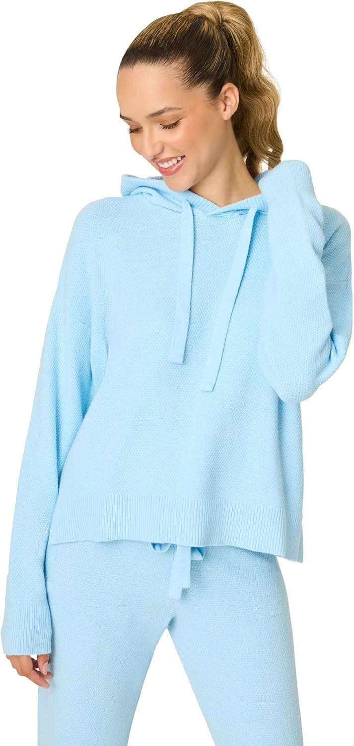 Women’s blue sweater knit hoodie with drawstring neckline and ribbed hem.