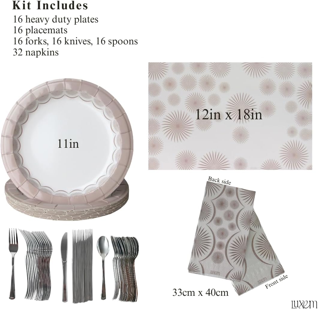 Host with ease, impress with style. Our Elegant Disposable Tableware Set for 16 guests is designed for modern hosts who value both sophistication and simplicity. Whether you're gathering friends for a dinner party, hosting a bridal shower, baby shower, birthday party, or holiday gathering, this set brings convenience without compromising on class. Each disposable dinnerware kit includes: 16 Premium 11" Heavy-Duty Plates – Durable, chic, and designed to hold full meals without bending 16 Stylish 18x12" Placemats – A polished backdrop that elevates every place setting 16 Forks, 16 Spoons, 16 Knives – Sleek plastic cutlery for a refined dining experience 32 Coordinated Napkins – Soft, absorbent, and designed to tie your table together. Each napkin features two elegant designs—one on each side—so you can pick and choose the look that best fits your table setting or mood. Crafted from high-quality materials, this premium plastic tableware set offers a luxurious feel while being entirely disposable. The elegant design—from subtle textures to refined patterns—adds effortless charm to any occasion. And with thoughtful packaging, setup and cleanup are a breeze. Perfect for: a) Dinner Parties & Celebrations b) Weddings, Receptions, Engagement Parties c) Bridal Showers & Baby Showers d) Holiday Events (Thanksgiving, Christmas, New Year’s, Labor Day) e) Everyday Meals with a Special Touch f) Corporate Events, Luncheons, Team Dinners g) Busy Families Who Love Beautiful Tables Without the Mess Create memorable moments without the cleanup. With a complete disposable dinnerware set for 16, this kit transforms any table into a stylish, stress-free centerpiece — perfect for entertaining with ease.
