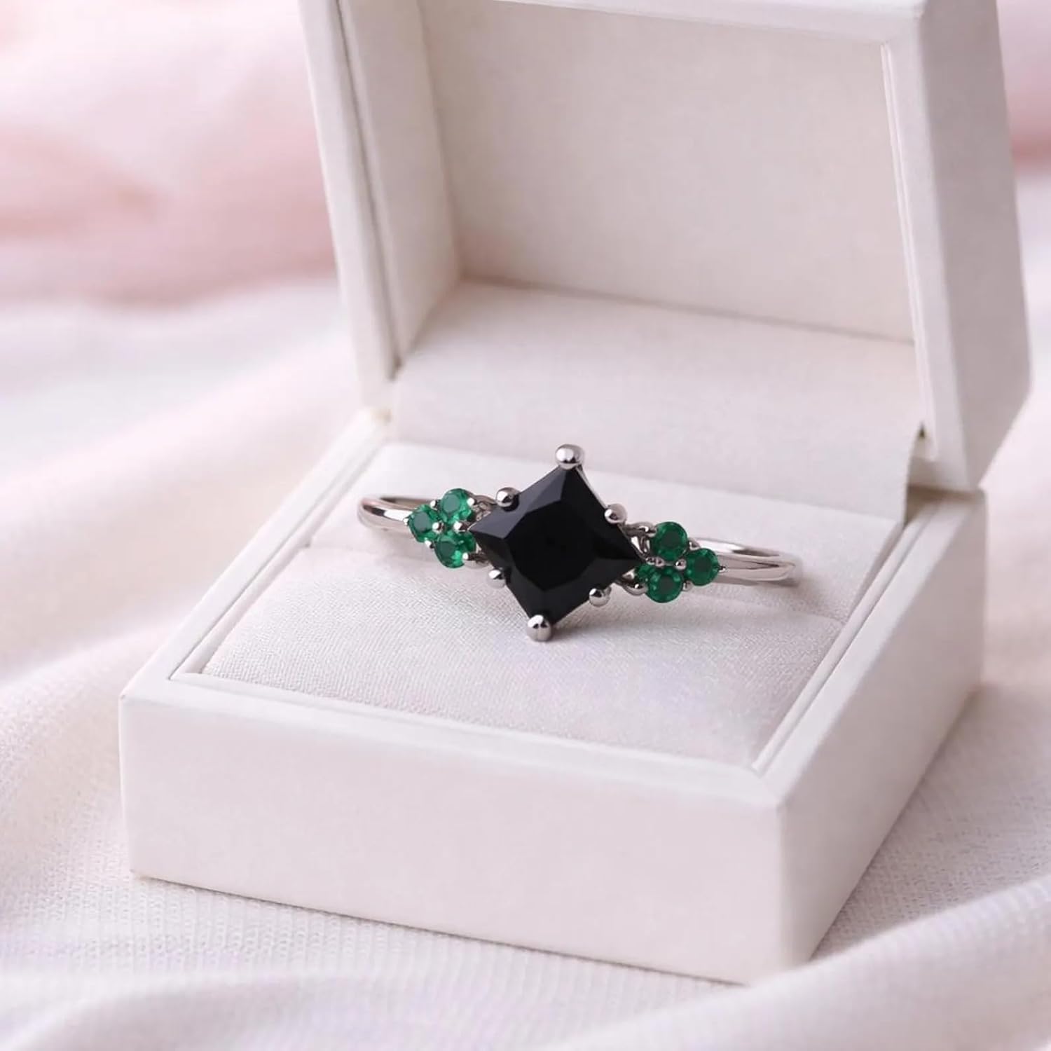Make a bold yet elegant statement with this stunning princess cut black gemstone ring, beautifully complemented by sparkling green accent stones on each side. Designed with a delicate band and modern cluster setting, this ring blends minimalism with timeless sophistication. The deep black center stone creates a striking contrast against the vibrant green side stones, making it perfect for everyday elegance or special occasions. Expertly crafted with attention to detail, this ring is ideal as a promise ring, engagement ring, anniversary gift, or a meaningful jewelry piece for someone special. Its sleek and refined design ensures comfortable wear while adding a touch of luxury to any look. A perfect choice for women who love unique, stylish, and eye-catching fine jewelry.