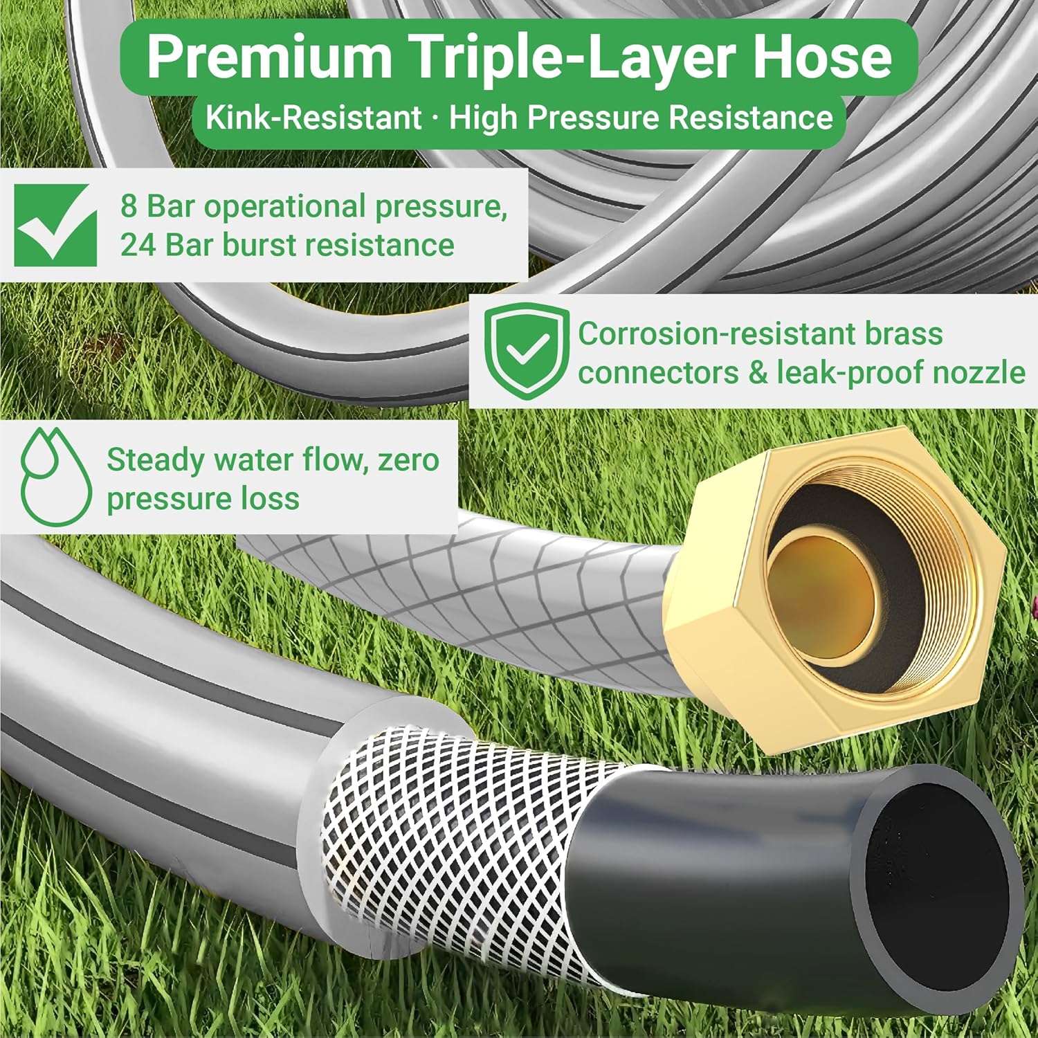 | Included Components | 1 x 130ft Retractable Garden Hose Reel, 1 x 180° Pivot Mounting Bracket, 1 x 6ft Lead-in Hose, 1 x 9-Pattern Spray Nozzle, 4 x Heavy Duty Wall Anchors (for brick/concrete) and 4 x Mounting Screws |