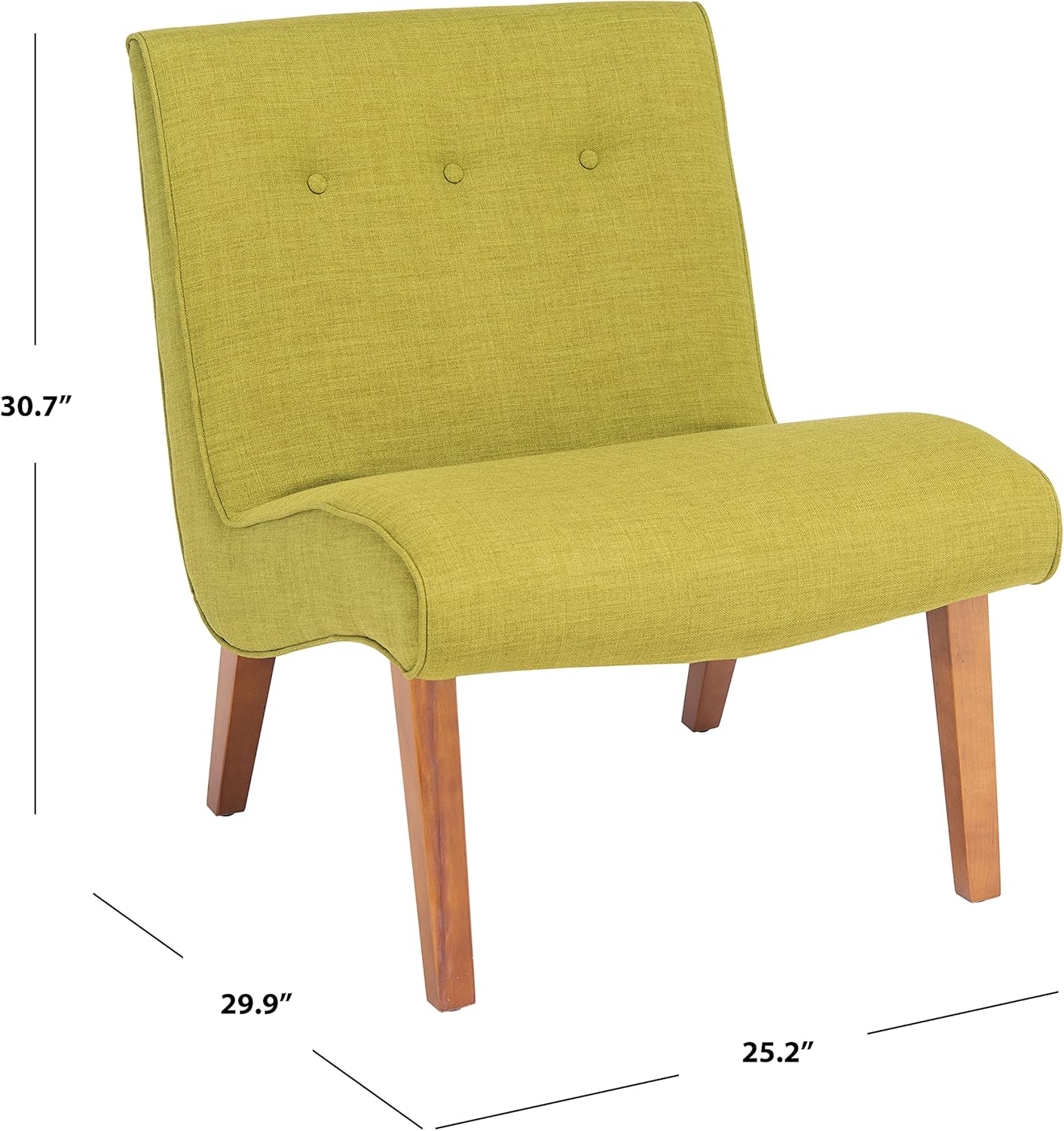 The retro-chic lines channeling the office chairs that made their way to living rooms across America in the 60’s define the sweet pea green upholstered Safavieh Mercer Collection Mandell Green Chair. Trendy in its simplicity, Mandell features birch wood legs of the period in natural oak finish, and is upholstered in a blend of polyester and viscose yarns for easy care. No assembly required, these chairs measure 25.2" x 29.9" x 30.7"