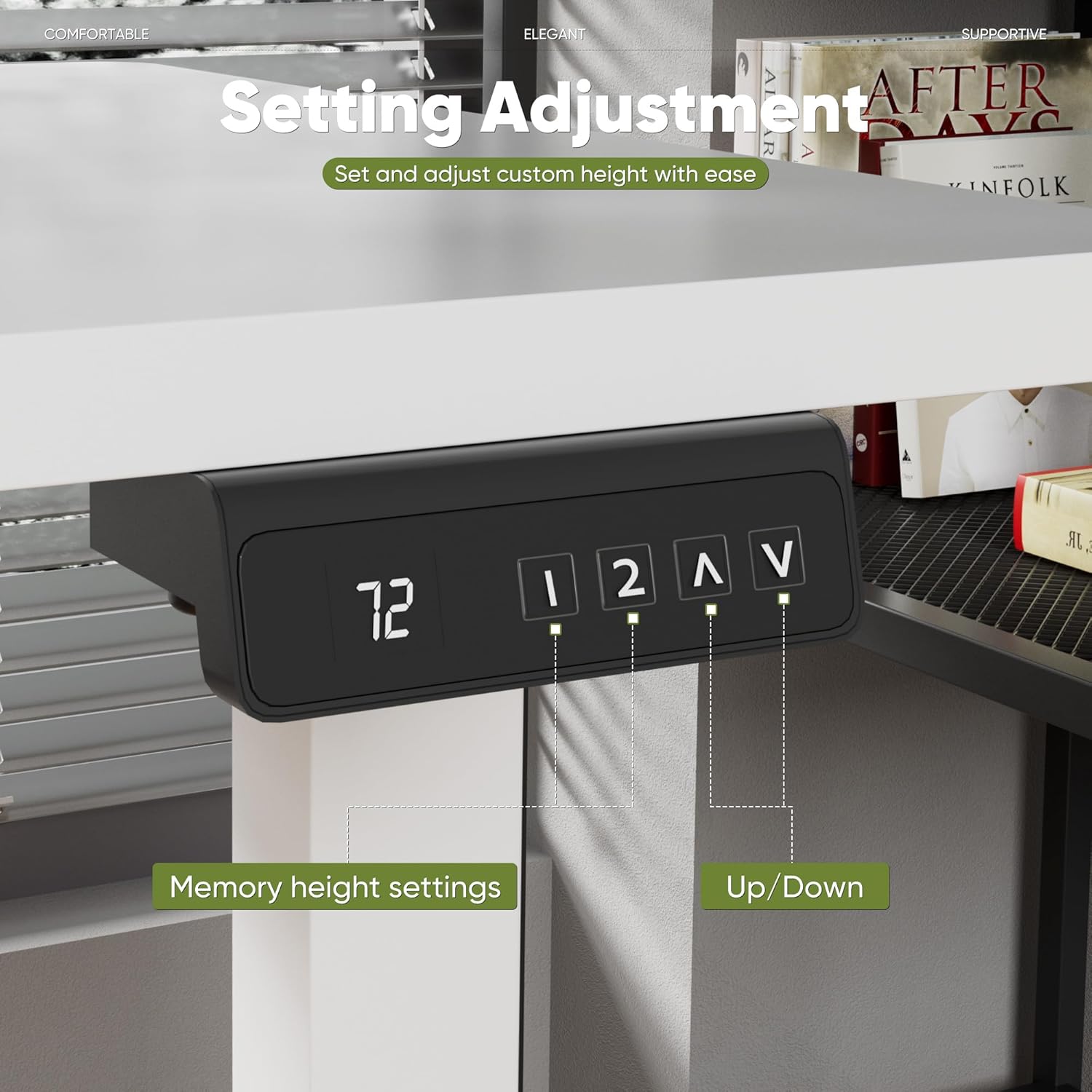 Shahoo Electric Height Adjustable Standing Desk Feature: Sturdy steel lift system and frame support up to 140 lbs, with motorized heightadjustment (28.7" to 46.4") for a healthy and comfortable work routine Dual electric motors ensure faster, stable, and quiet height adjustments for an enhanced work experience The elegant electric table top (approx. 47") provides ample workspace, boosting productivity Specification: Color: White Material: Wood, Steel, Metal Package Dimensions:33.46"(L) x25.39"(W) x 5.31"(H) Package includes: An electric standing desk A tool kit A manual of installation and usage Notice: There may be some differences between photos and items in term of color because the influence of lighting during the shooting or the settings of the computers’ display screen.