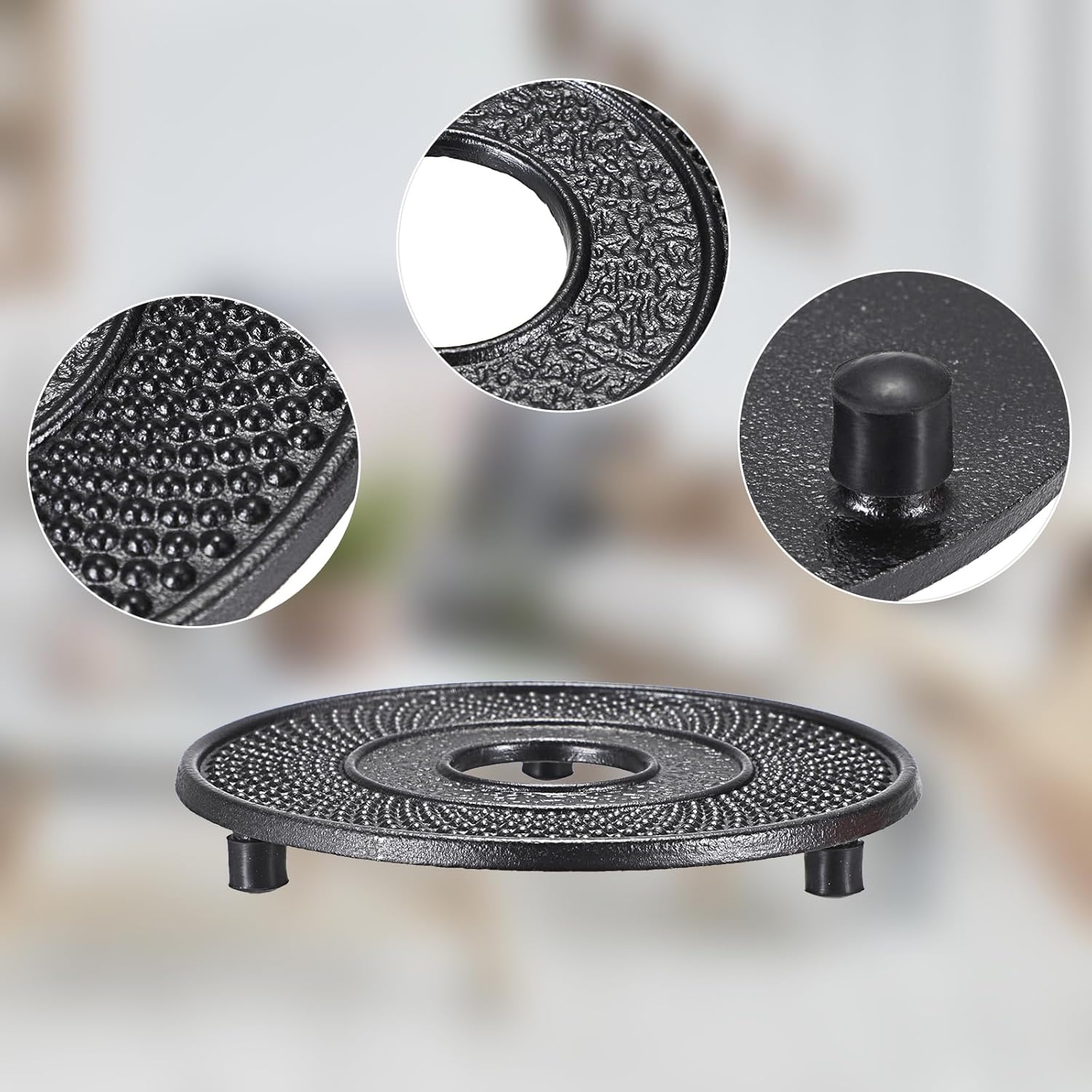 Descriptions:Our tea pot trivet for kitchen is used widly and can hold not only tea pot but also mug,coffee cup,patterned ceramic cup, glass cup, milk pot, plate, clay pot,ect.Due to simple but functional features,it's perfect to use for kitchen,living room,office,dining table or countertop. Four non-slip rubber covers are designed on the bottom of the tea pot trivetwhich can prevent the trivet from rubbing against the countertop and causing scratches,while effectively protecting the countertop from being scratched by hot utensils. Its vintage look fits well with any home or office decor.These trivets for tea pot are made of premium cast iron materials with black coating on the surfacewhich is heat-resistant, wear-resistant,rust-resistant and sturdy for long time using.Cast Iron trivets for table are small without taking too much space and easy to use without installation.Besides, simple structure make it convenient for you to clean.A decorative and functional teapot mat is an idea gift to share with your friends and family at house warming parties, Birthdays,Thanksgiving and other holidays. It is especially suitable for home, afternoon tea party, study or office scenarios .Specifications:Material: Cast Iron Color: BlackPackage:2 xTea Pot Trivet