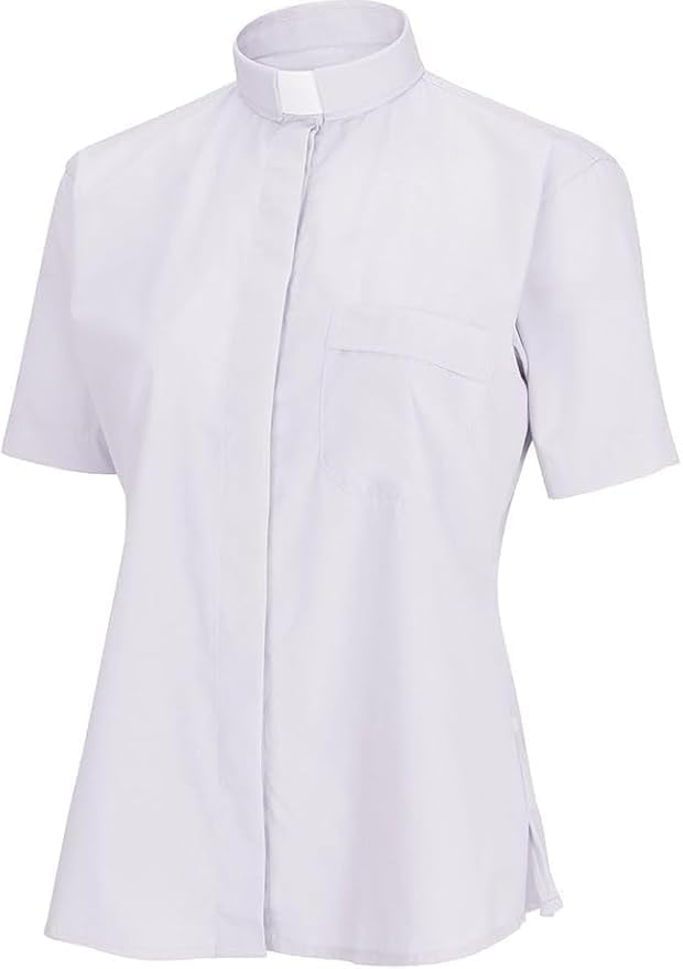 Womens Short Sleeves Tab Collar Clergy Shirt (White) This Mercy Robes short sleeve tab collar clergy shirt is the highest quality in the ecclesiastical apparel collection. The shirt is beautifully designed with an slip in tab collar that is made to ensure a crisp collar performance. One left front pocket is on the left side. Fabric: 65% Cotton, 35% Polyester