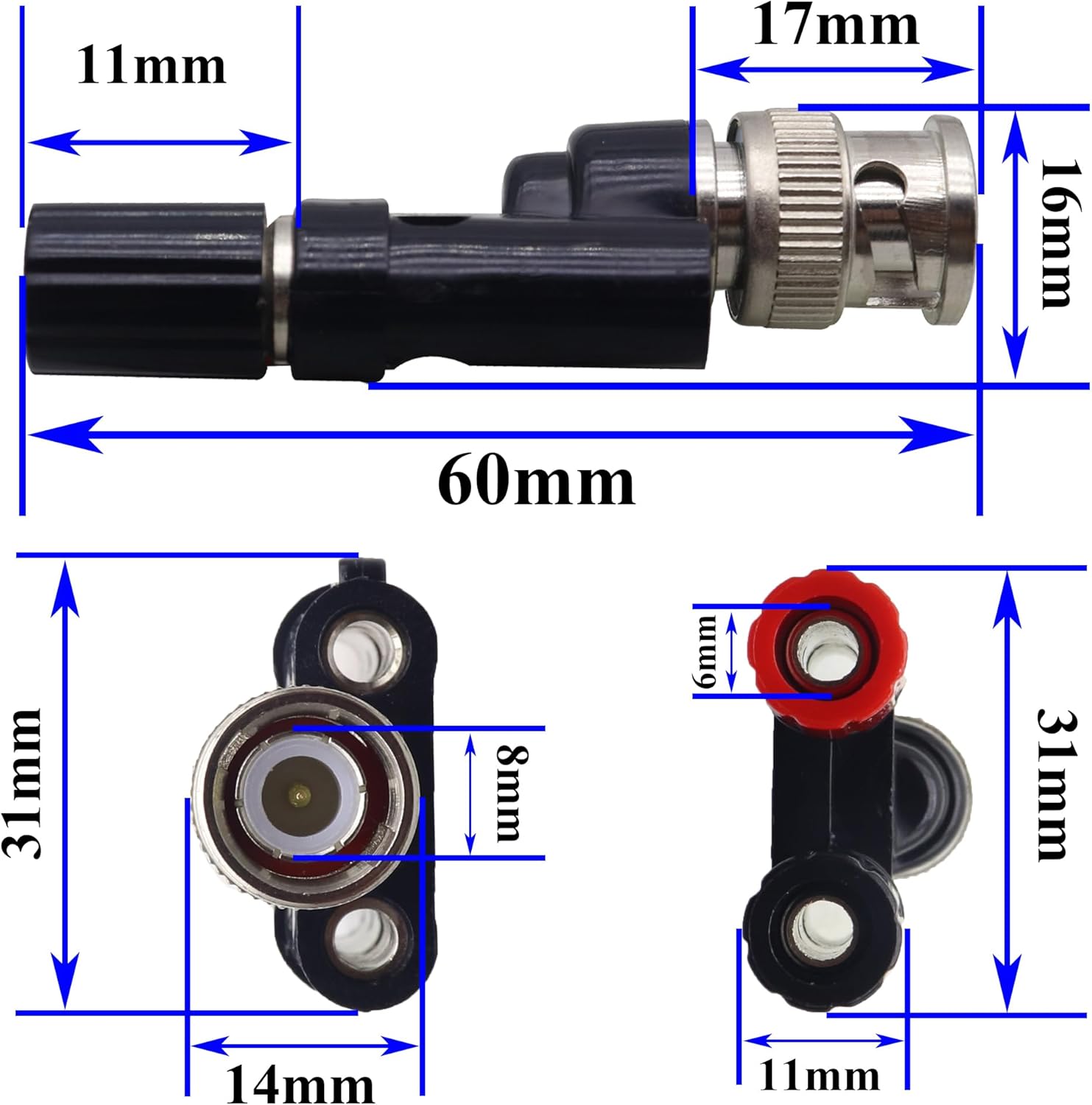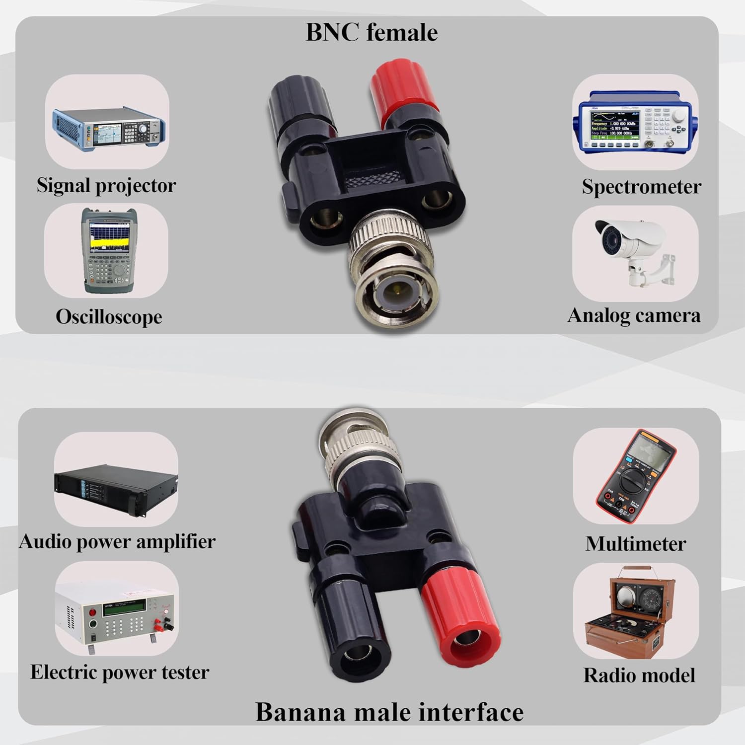 size: (5.9cm×3.1cm×1.6cm)Color: (black and red) Quantity: (2 pcs) Material: metal +PTFE, Connector: BNC male to 2×4mm banana female adapter. BNC interface impedance: the standard is 50Ω. BNC male interface is mainly used for high-frequency signal transmission and testing signal accuracy, and double banana female terminal is used to connect test leads or other components. When the interfaces of the two devices are different or the coaxial cable interfaces do not match, you can use this product (BNC/ double banana terminal interface device only) to solve your device connection problem. It can convert the interface at one end into (BNC male connector/double banana female connector), and can be connected with equipment or cables with BNC female connector and double banana male connector, with strong compatibility and quick connection without welding, (only applicable to 50Ω equipment) BNC male plug-to-2×4mm banana female terminal is suitable for applications and experiments in many different scenarios, such as oscilloscope multi-channel monitoring, antenna signal distribution, radio equipment expansion, audio equipment debugging, power amplifier signal shunting, speaker impedance measurement, etc. TThe interface is made of high-quality nickel plated brass, and the shell is made of PTFE material, which is sturdy, durable, and not easily oxidized. It has the characteristics of reducing signal loss, reducing contact resistance, high temperature resistance, safety and reliability, making it safer to use.