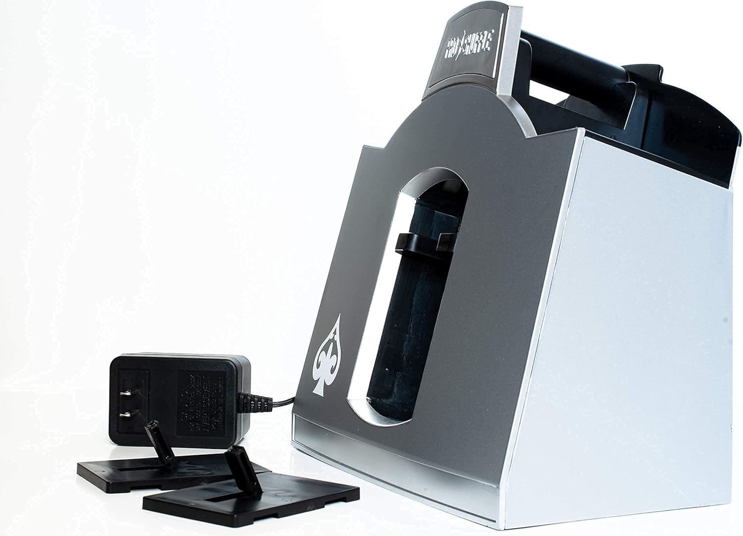 Pro Shuffle automatic 1 to 6 deck shuffler. Bicycle cards are the only brand we recommend and must measure 3.5 X 2.5 inches. The unit shuffles cards the best Face Up. Smaller cards like UNO, 5 Crowns, Skip Bo or bridge size (2.25 X 3.5 inches) and cards in board games will not work. Works best plugged in. It has an ON/OFF switch. Custom Silver Wrap for a better look. Because of its design, cards come out of the shuffler much easier. Includes the Shuffler, weights, power cord. Batteries not included.