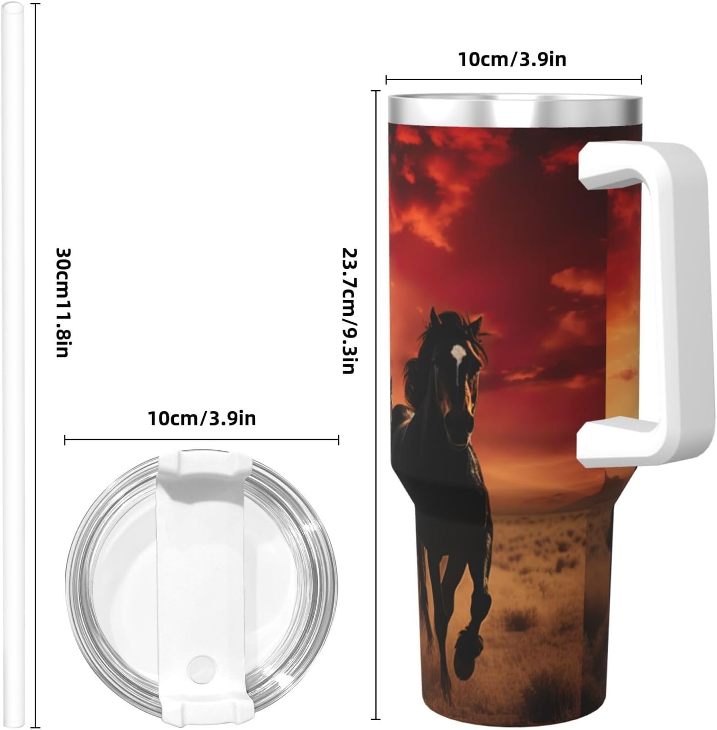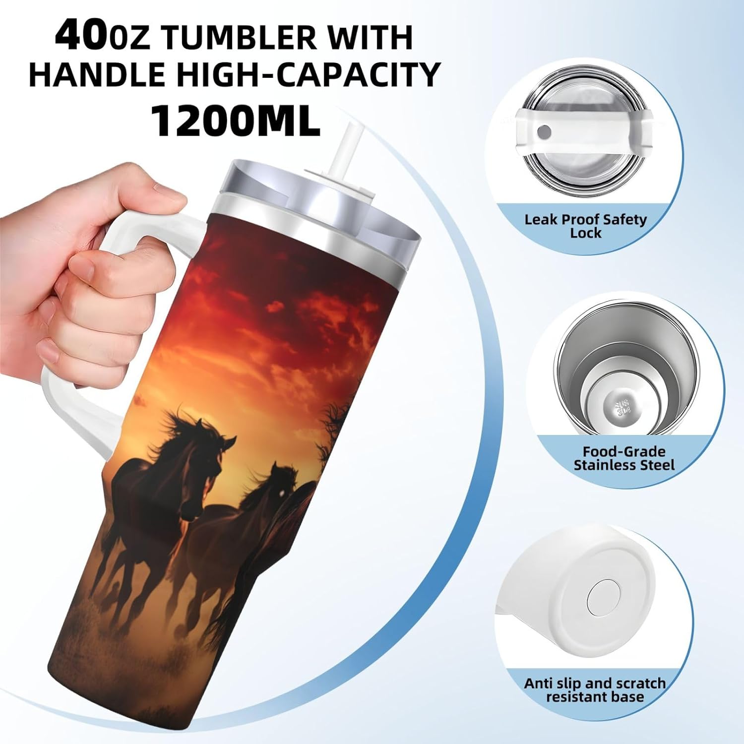 This Black Horses Print Ice Bully Cup features a double layer stainless steel design that can be used for a long time without rusting. The lid has good sealing to prevent water from overflowing, and it is easy to unscrew for filling and cleaning. It can keep water, coffee, or drinks warm or cool for hours and is suitable for travel, camping, and driving.