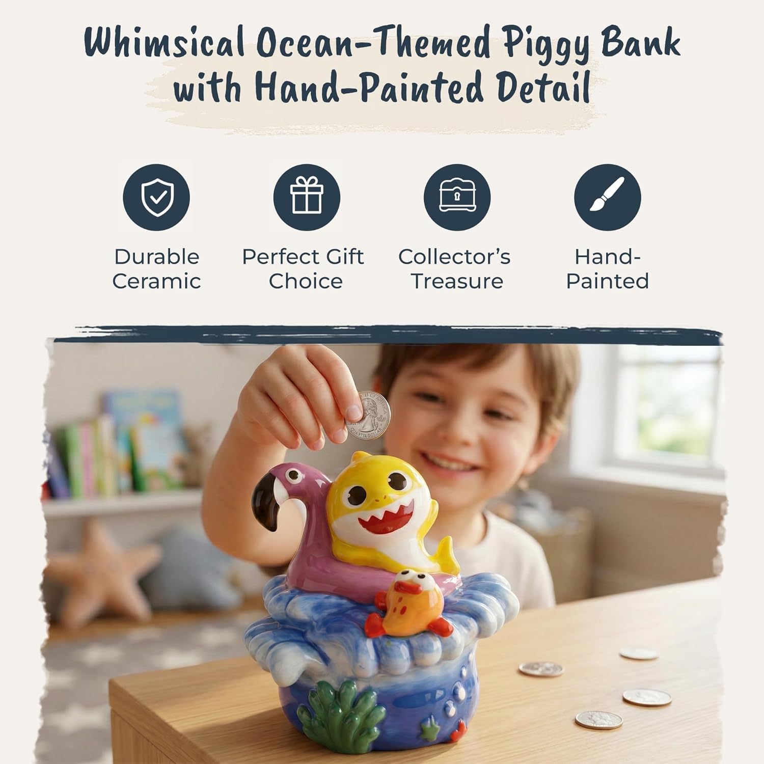Make saving simple and fun with this Lazy Days Baby Shark piggy bank. The hand painted ceramic finish highlights bright character details while the compact size fits easily on shelves and nightstands. Crafted from ceramic, made in China.
