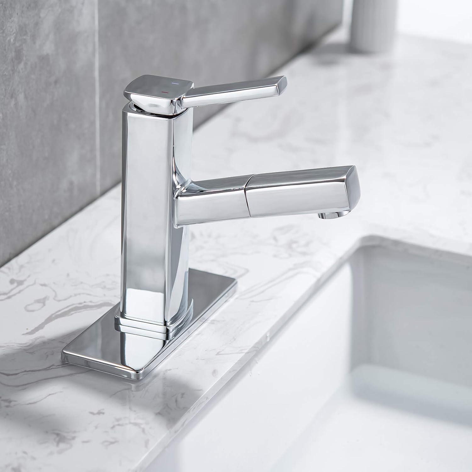 FAUCET, POP UP DRAIN, COVER DECK PLATE COMBO: KAIYING Bathroom Sink Faucet with Pull Out Sprayer (Regular, Chrome & White) & KAIYING Pop Up , Bathroom Sink Stopper with Overflow (Chrome) & KAIYING 6" Hole Cover Deck Plate for Bathroom Vanity Sink (Chrome)