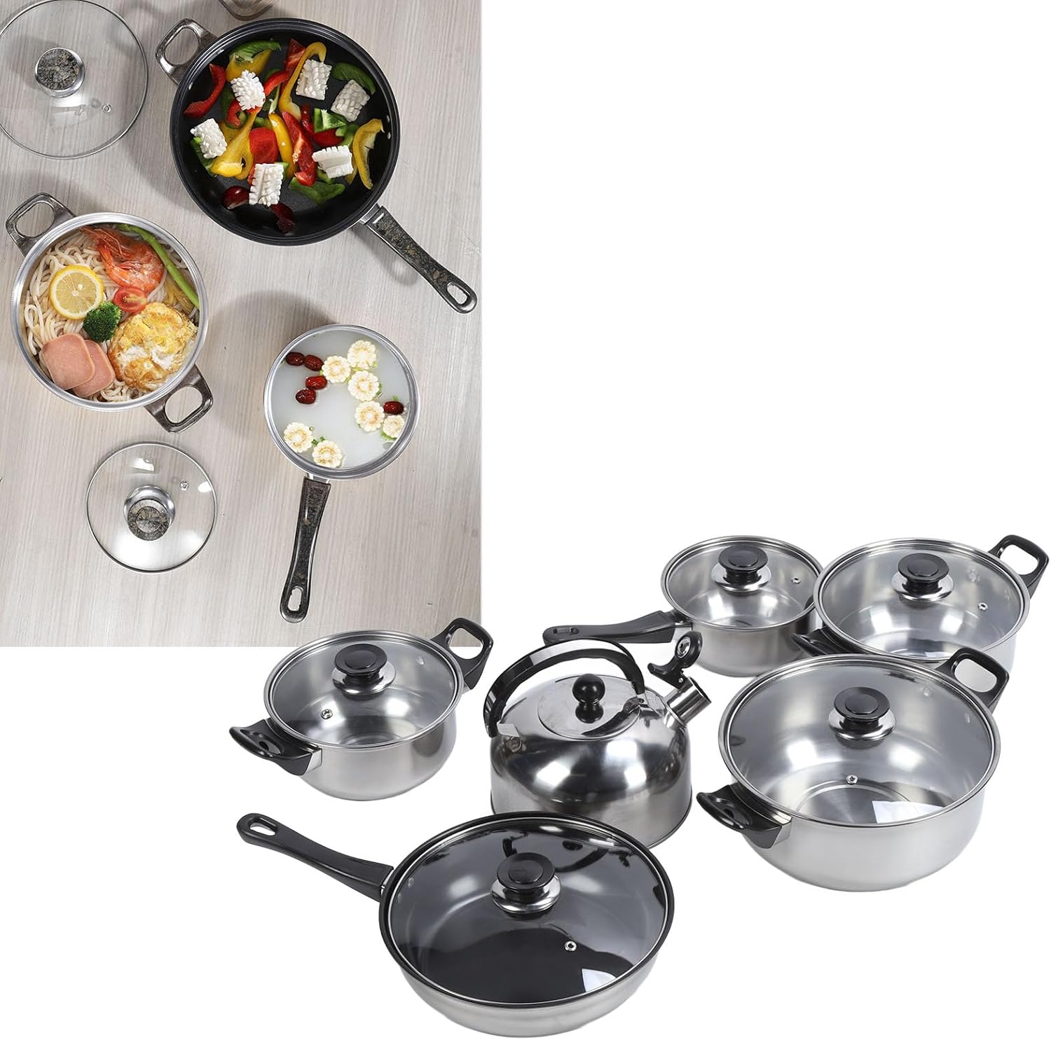 Item Type: Cookware SetMaterial: Glass, Stainless Steel, PlasticWeight: Approx. 2975.00g / 104.94ozFrying Pan Size: Approx. 19.5x6cm / 7.7x2.4inSaucepan Size: Approx. 11.8x7.3cm / 4.6x2.9inKettle Size: Approx. 19x10cm / 7.5x3.9inStock Pot Size: Approx. 19.5x10cm / 7.7x3.9inStock Pot Size: Approx. 15.5x9cm / 6.1x3.5inStock Pot Size: Approx. 13.5x7.5cm / 5.3x3.0inPackage List:5 x Pots1 x Kettle5 x Pot Covers19 x Screws2 x Long Handles3 x Handle Decorative Rings6 x Pot Handles5 x Pot Cover Decorative Rings5 x Pot Cover Handles5 x Gaskets