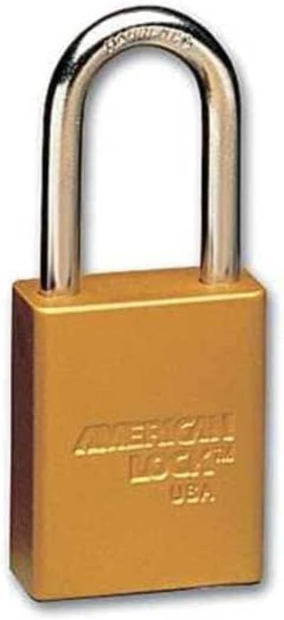 'Lockout Padlock, Key Type Alike, Body Material Aluminum, Shackle Dia. 1/4 In., Shackle Height 1-1/2 In., Shackle Material Chrome Plated Hardened Steel, Shackle Width 3/4 In., Body Width 1-1/2 In., Body Thickness 3/4 In., UL Environment Claims Validation, Body Height 1-7/8 In., Body Color Yellow, Shackle Type Open, Number of Keys 2, Number of Pins 5, Padlock Body Shape Rectangular, Features Additional packs will operate on different keys, Package Quantity 3'