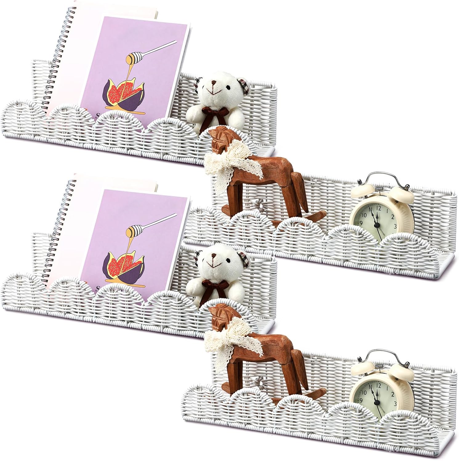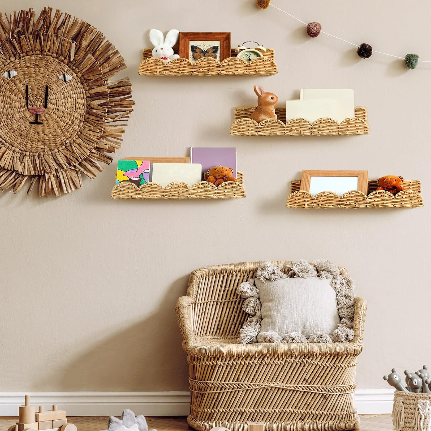 Features: Exquisite appearance: These nursery book shelves adopt Bohemian style designs, with fake rattan scalloped, which is helpful for you to create a boho ambience to your home. Gift idea: Hanging nursery book will be a wonderful gift for your close friend, family, colleagues, nursery, neighbors or others who love creativity at housewarming parties. Specifications: Material: Plastic Color: Boho Color Package includes: 4 x Nursery Book Shelves Notes: Manual measurement, please allow slight errors on size. The color may exist a slight difference due to different screen displays.