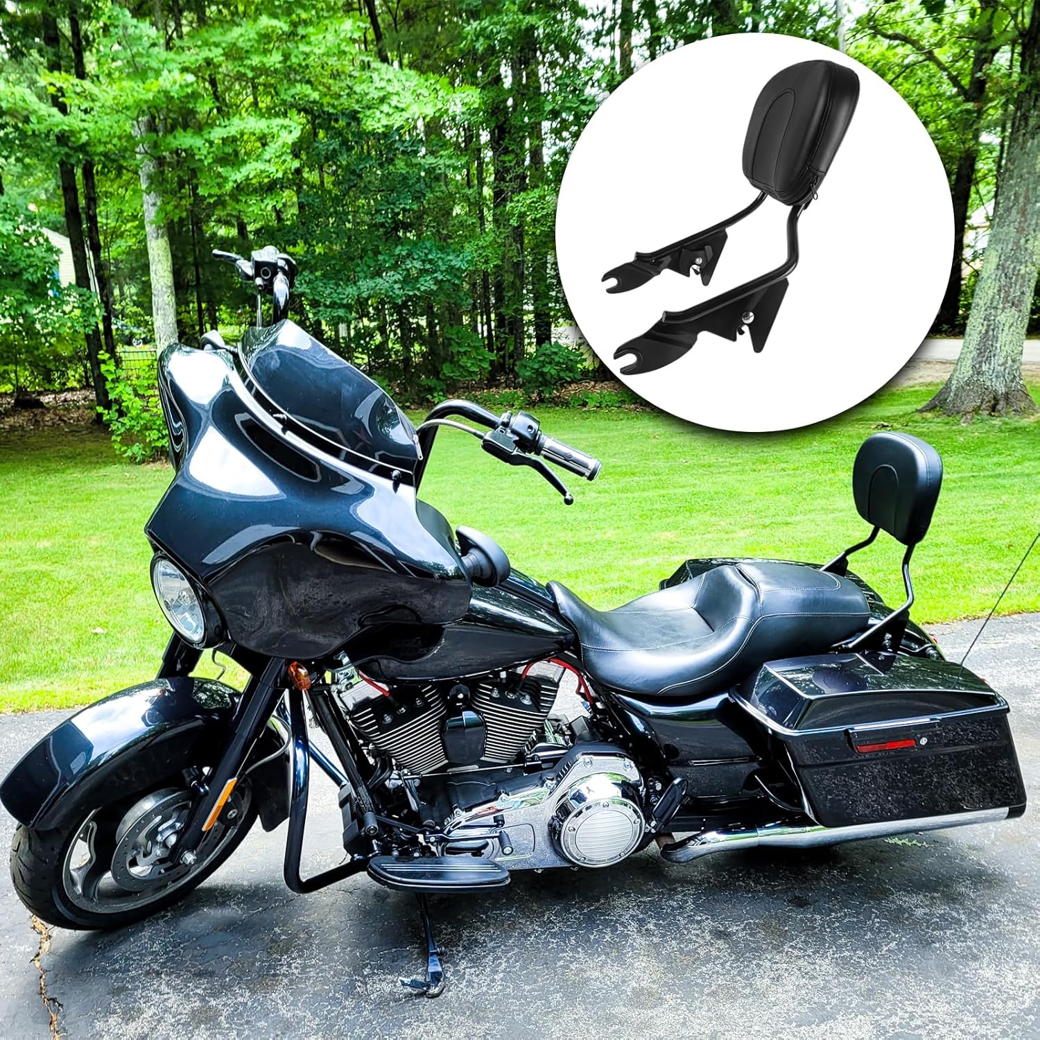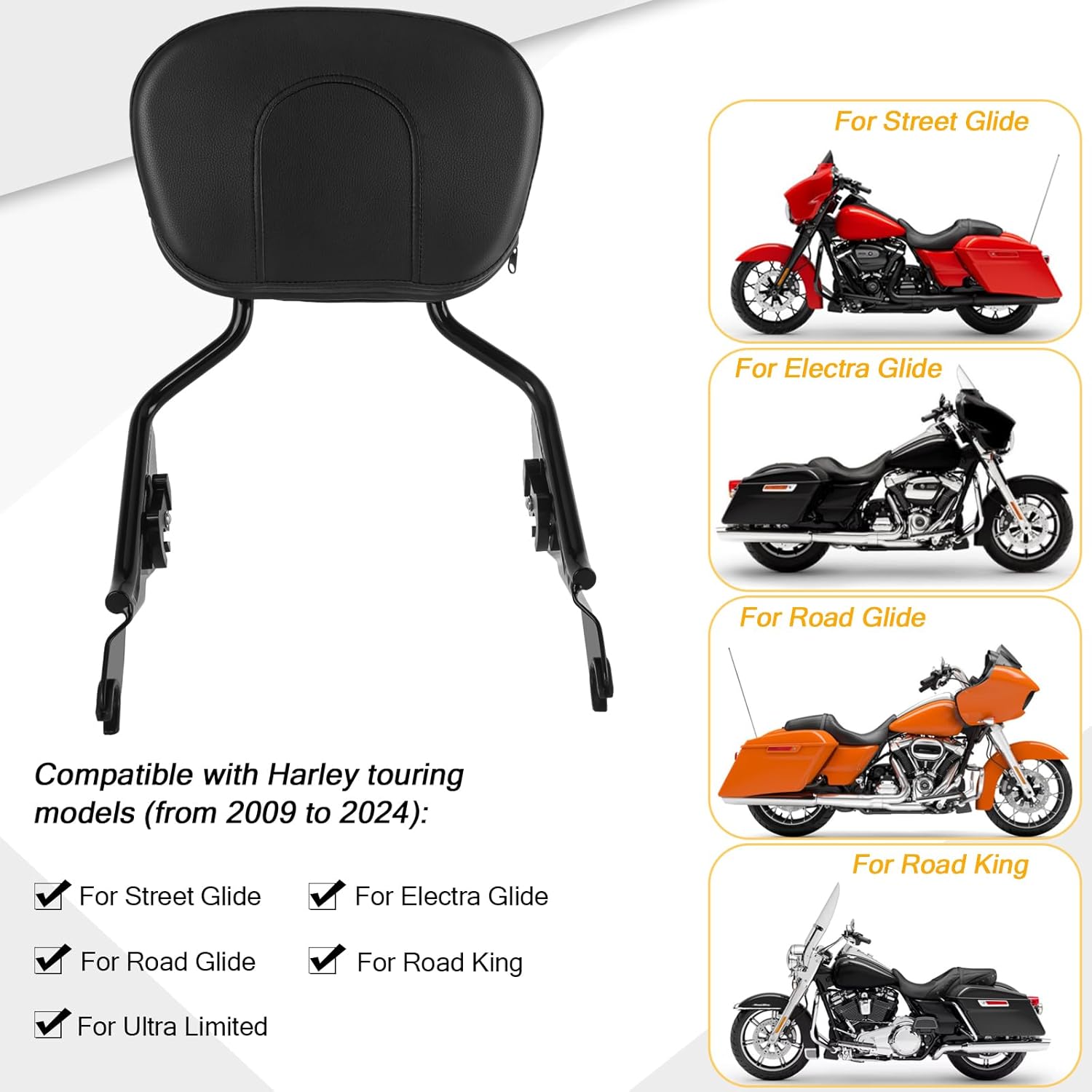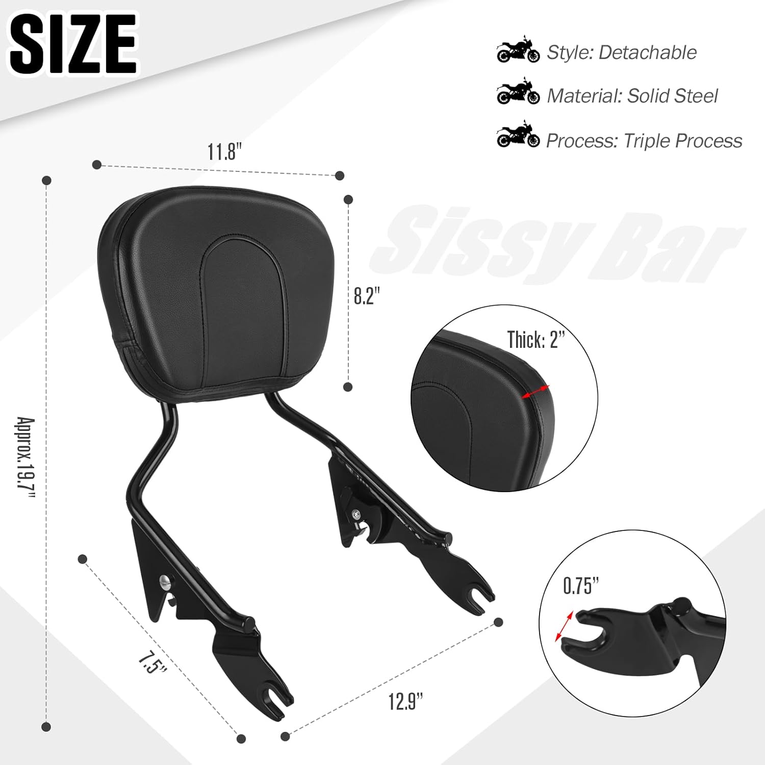 Sissy Bar for Harley Touring, Detachable Passenger Backrest Compatible with Harley Davidson Backrest Street Glide Road Electra Glide 2009-2024, Black STYLISH AND PROTECTIVE FINISH Finished in a sleek black coating, not only does it add a touch of sophistication to your motorcycle, but it also protects against rust and corrosion, ensuring long-lasting durability and a polished appearance. Detachable Passenger Backrest ROBUST CONSTRUCTION Made from high-strength steel, our sissy bar provides a solid and secure backrest for your passenger, minimizing vibrations and enhancing comfort on extended rides. DETACHABLE DESIGN Effortlessly switch between a sleek solo look and passenger comfort with the quick detach mechanism. Perfect for when you want to hit the road solo or take a friend along for the ride. FEATURES Sturdy Solid Steel The strong triangular structure of the back, not easy to break Premium Latch Clip Lock the sissy bar sturdily on your motorbike Black Plated Finish Durable material for rusting resistance and long service time PU Leather Waterproof to improve the durability and comfort experience High Density Sponge Reduce fatigue and enhancing the riding experience Durable and Stylish The sleek black finish ensures it stands out on the road UNIVERSAL COMPATIBILITY Detachable passenger backrest compatible with a wide range of Harley-Davidson touring models including Street Glide, Road Glide, Road King, Electra Glide, and Ultra Limited from 2009 to 2024. Please ensure compatibility with your specific model before purchase. Sissy Bar for Harley Davidson Touring SPECIFICATIONS Material: Solid Steel Backrest Pad Material: : PU Leather & Polyurethane Sponge Pad Measurement: Approx. 11.8" x 8.2" x 2" Sissy Bar Height: Approx.19.7" Process: Triple Process Style: Detachable Color: Black EASY INSTALL Come with install hardware, can be quick-detach, fit Pre-cut holes, adjust and remove the quick detach sissy bar, ensures perfect adaption. Why Choose Our Black Sissy Bar? Whether you’re embarking on a solo adventure or touring with a passenger, our sissy bar prioritizes safety, comfort, and style. PACKAGE INCLUDED 1X Passenger Sissy Bar Backrest NOTE: The Backrest is unassembled.